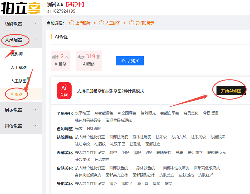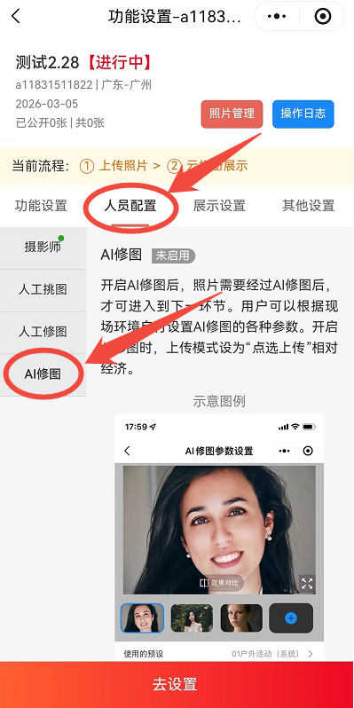 我创建的相册→功能设置→人员配置→AI修图→开始AI修图→选择AI精修