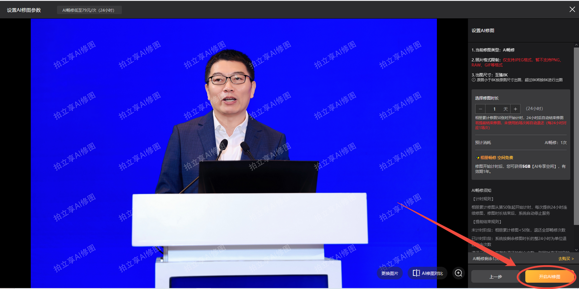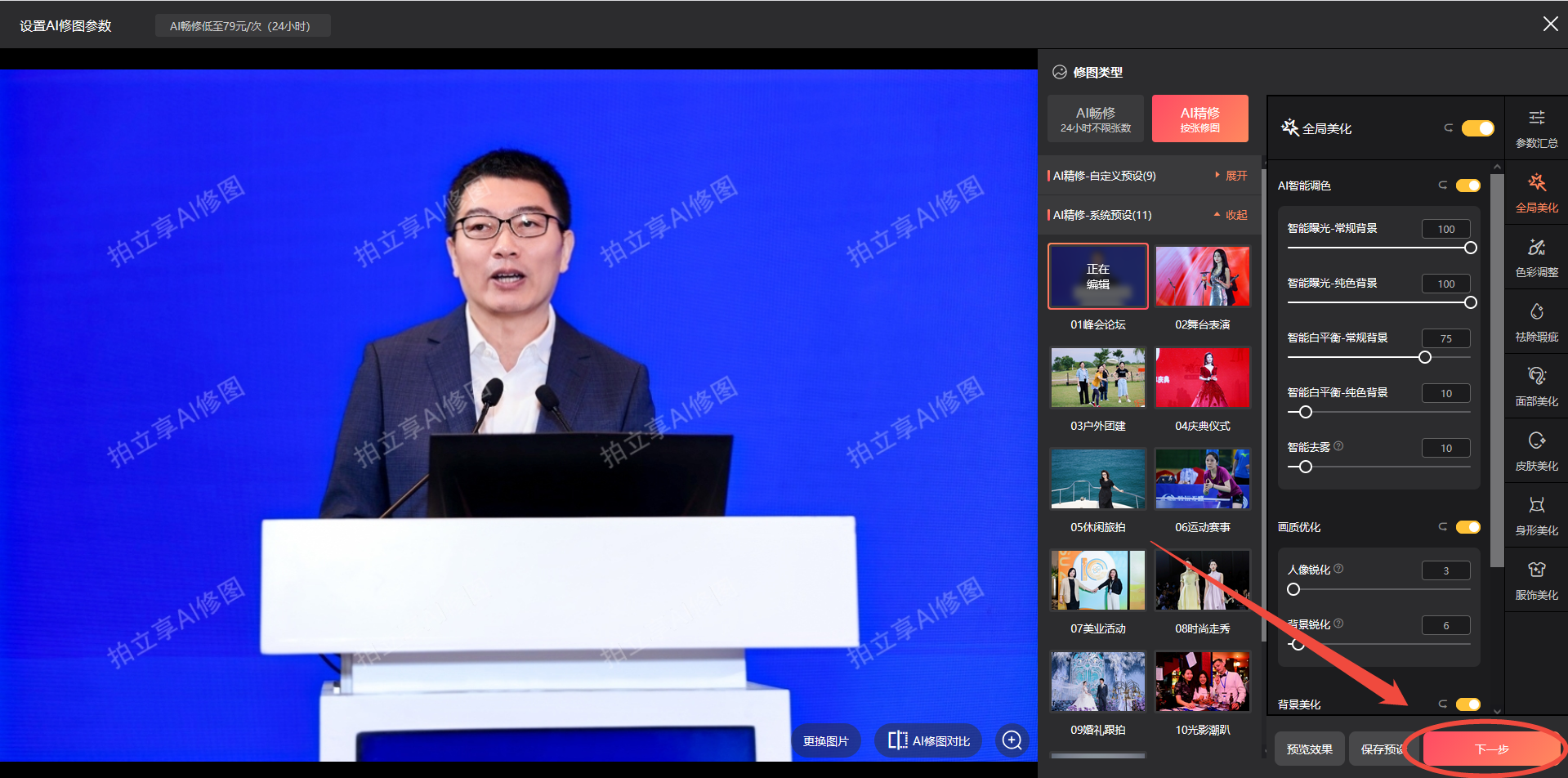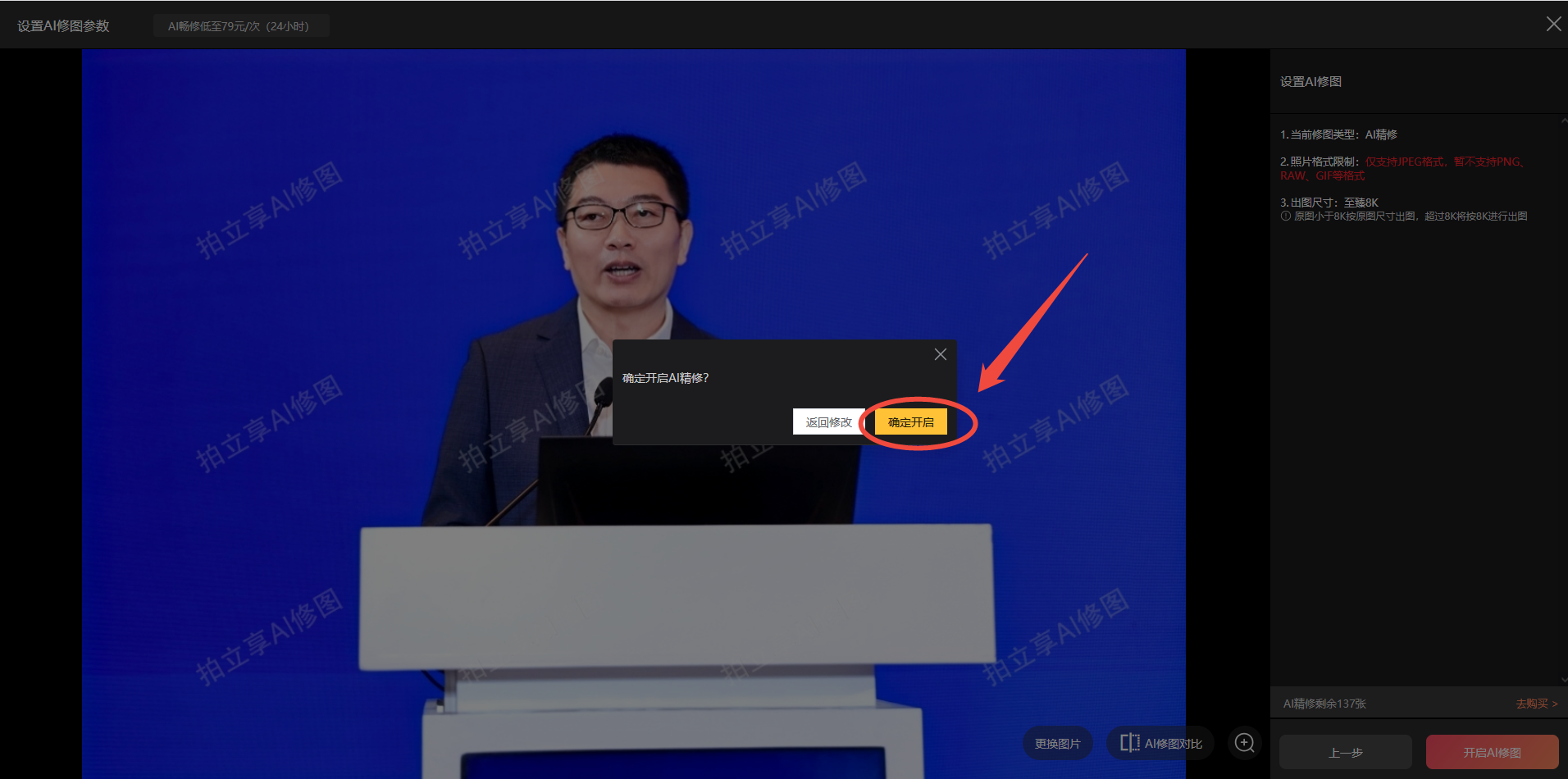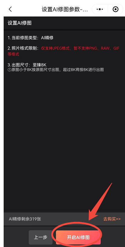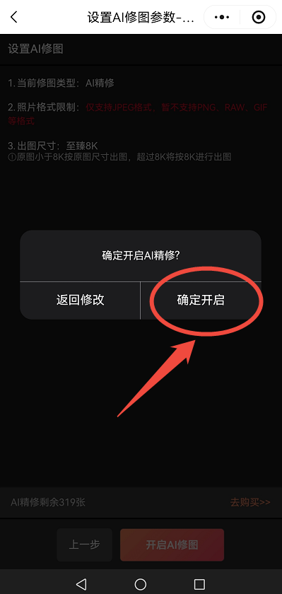 参数确认后→下一步→开启AI修图→确定开启