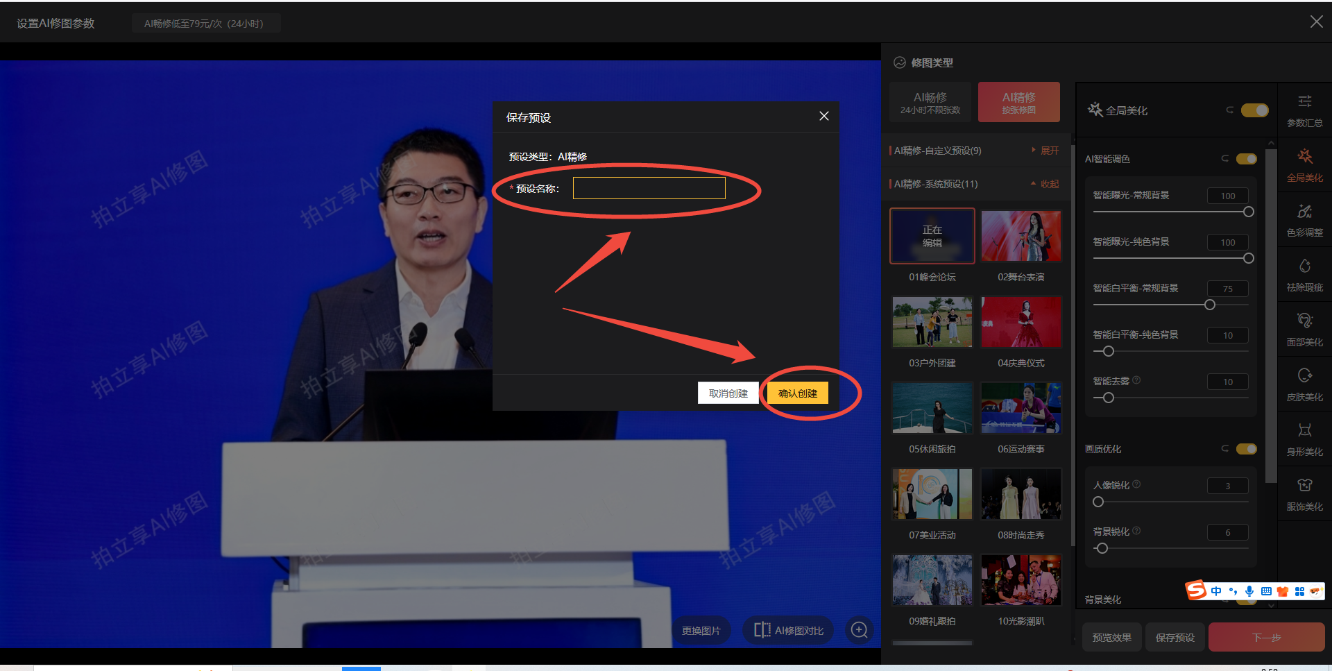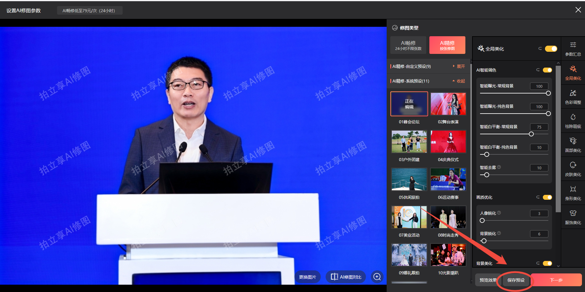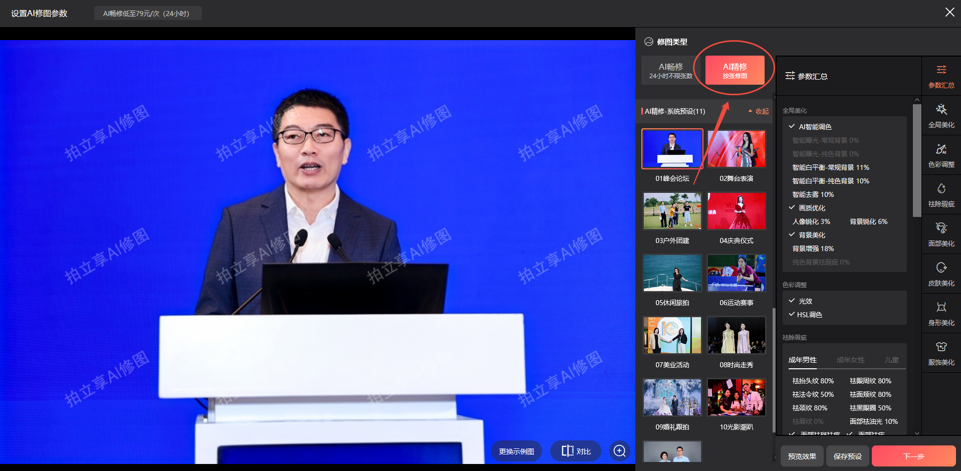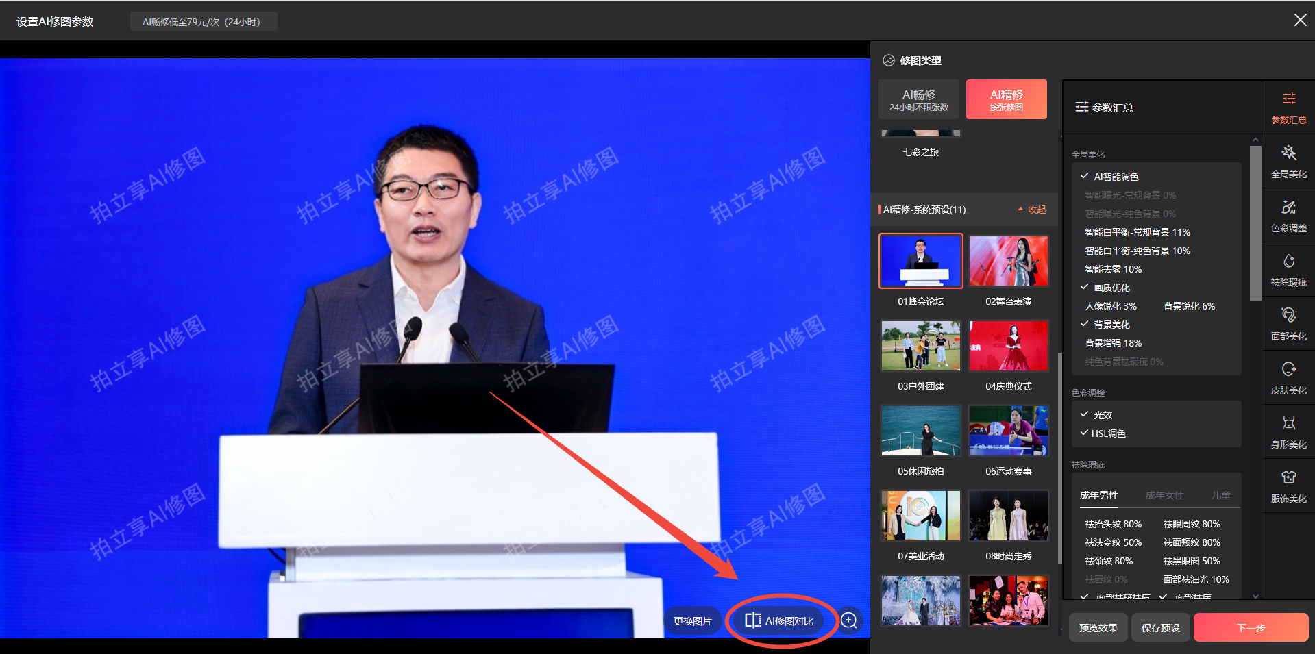 参数确认后→下一步→开启AI修图→确定开启