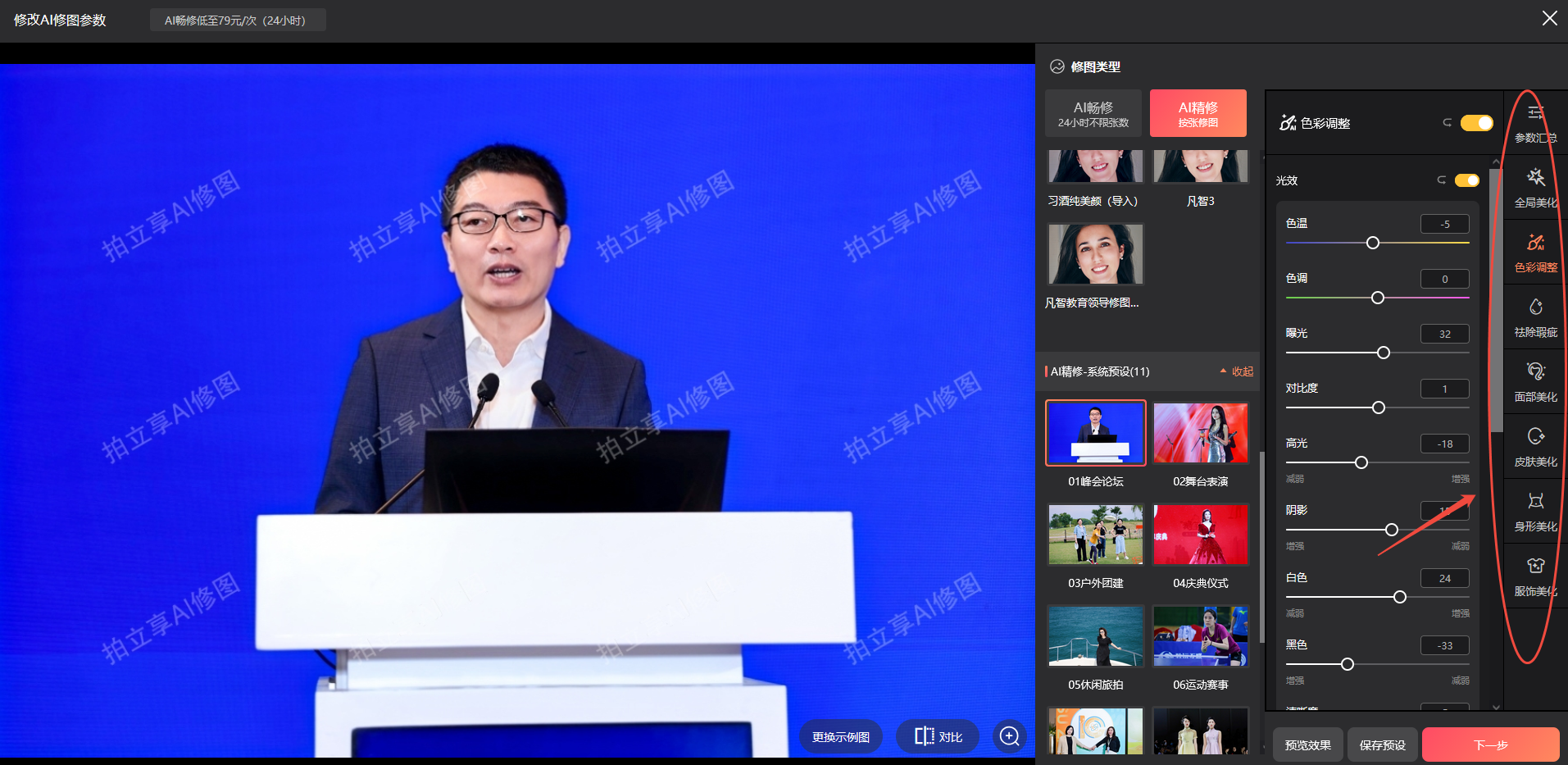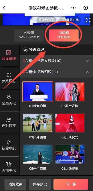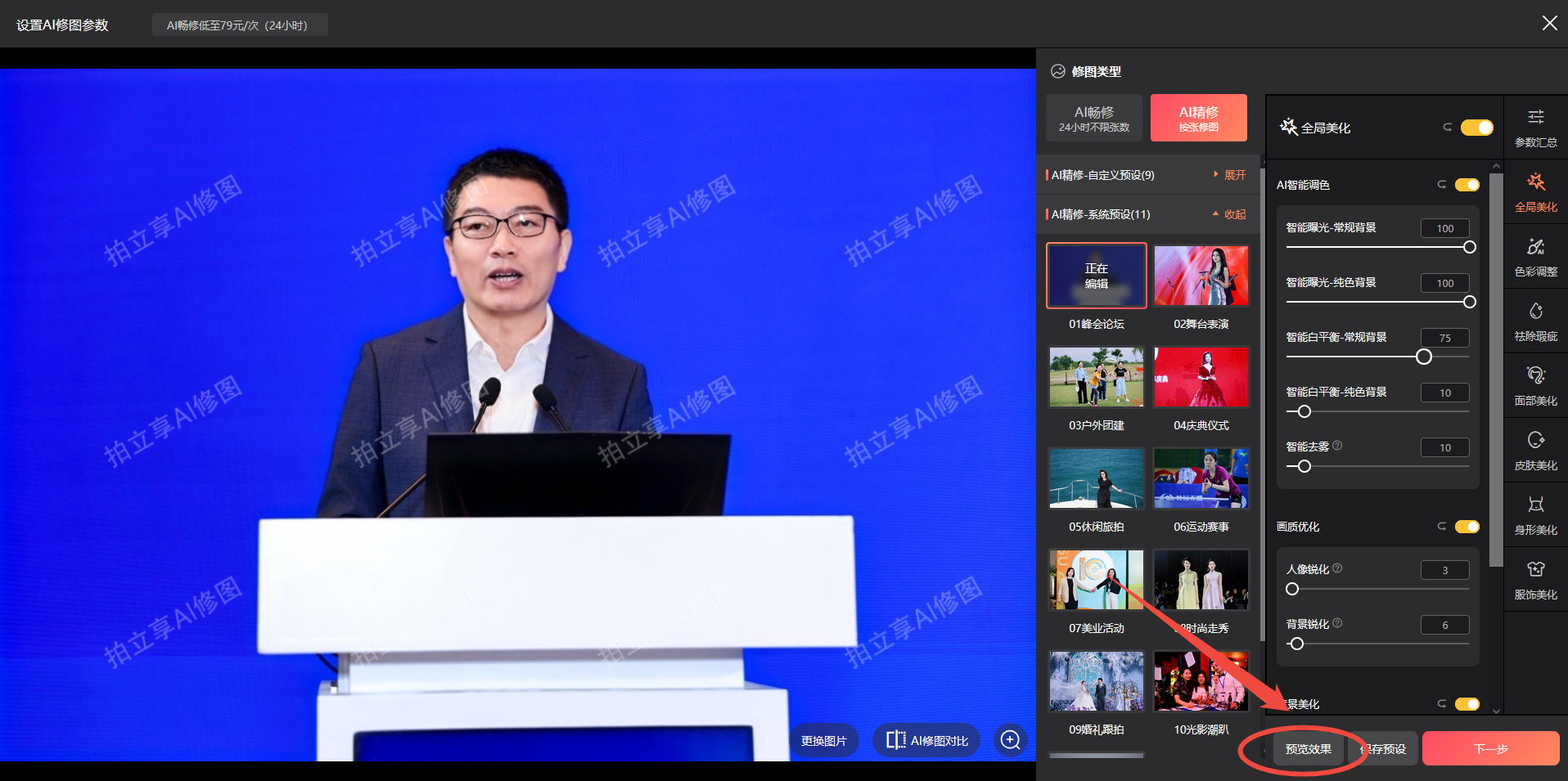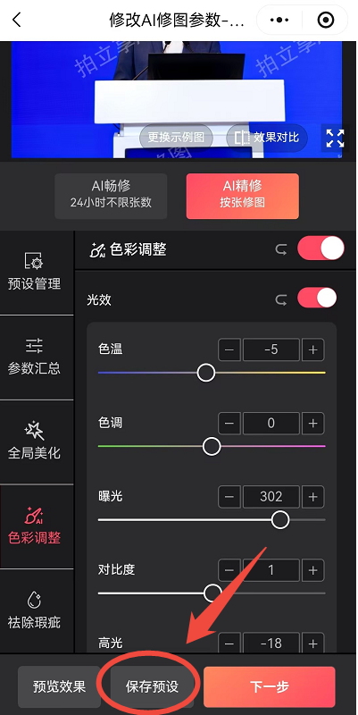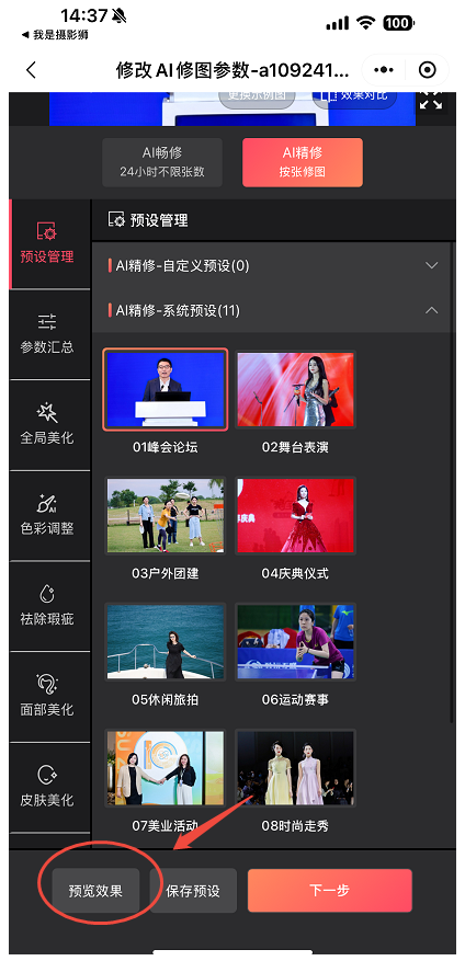 如需预览修改参数后的修图效果,可点击右下角“预览效果”进行预览