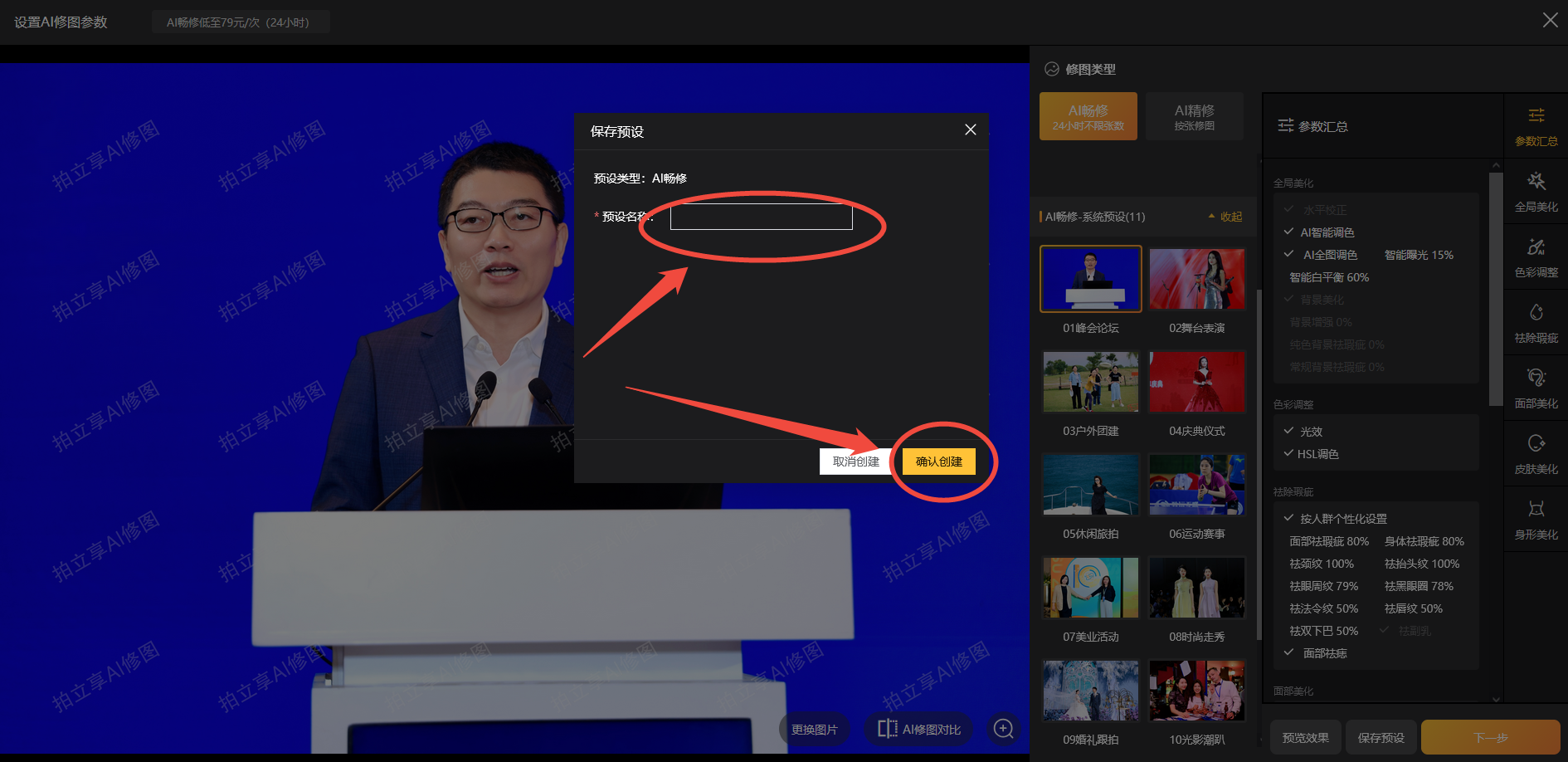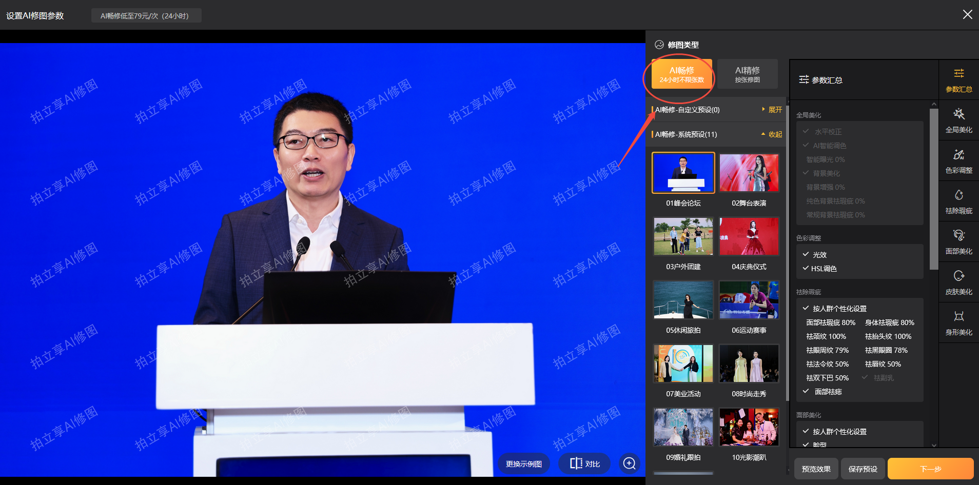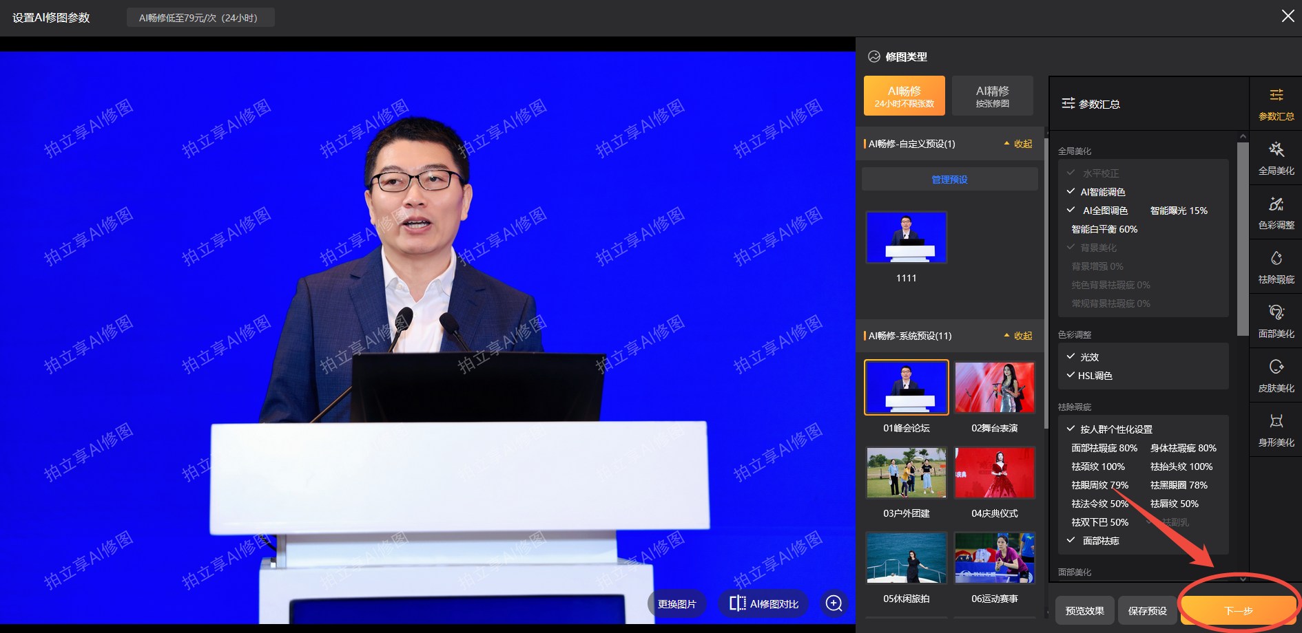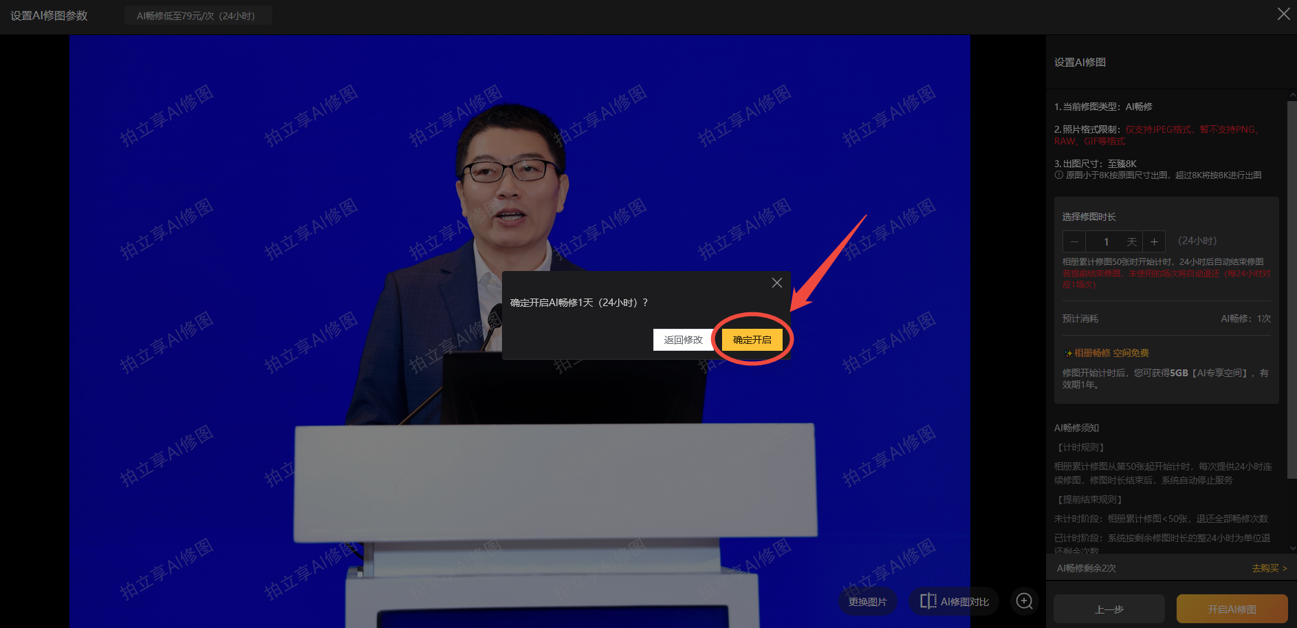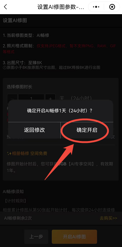 参数确认后→下一步→选择修图时长→开启AI修图→确定开启