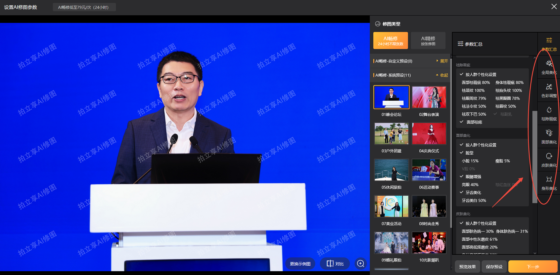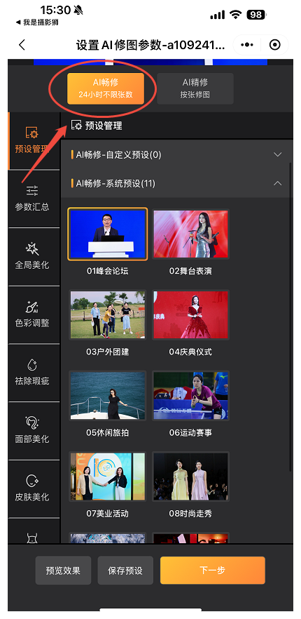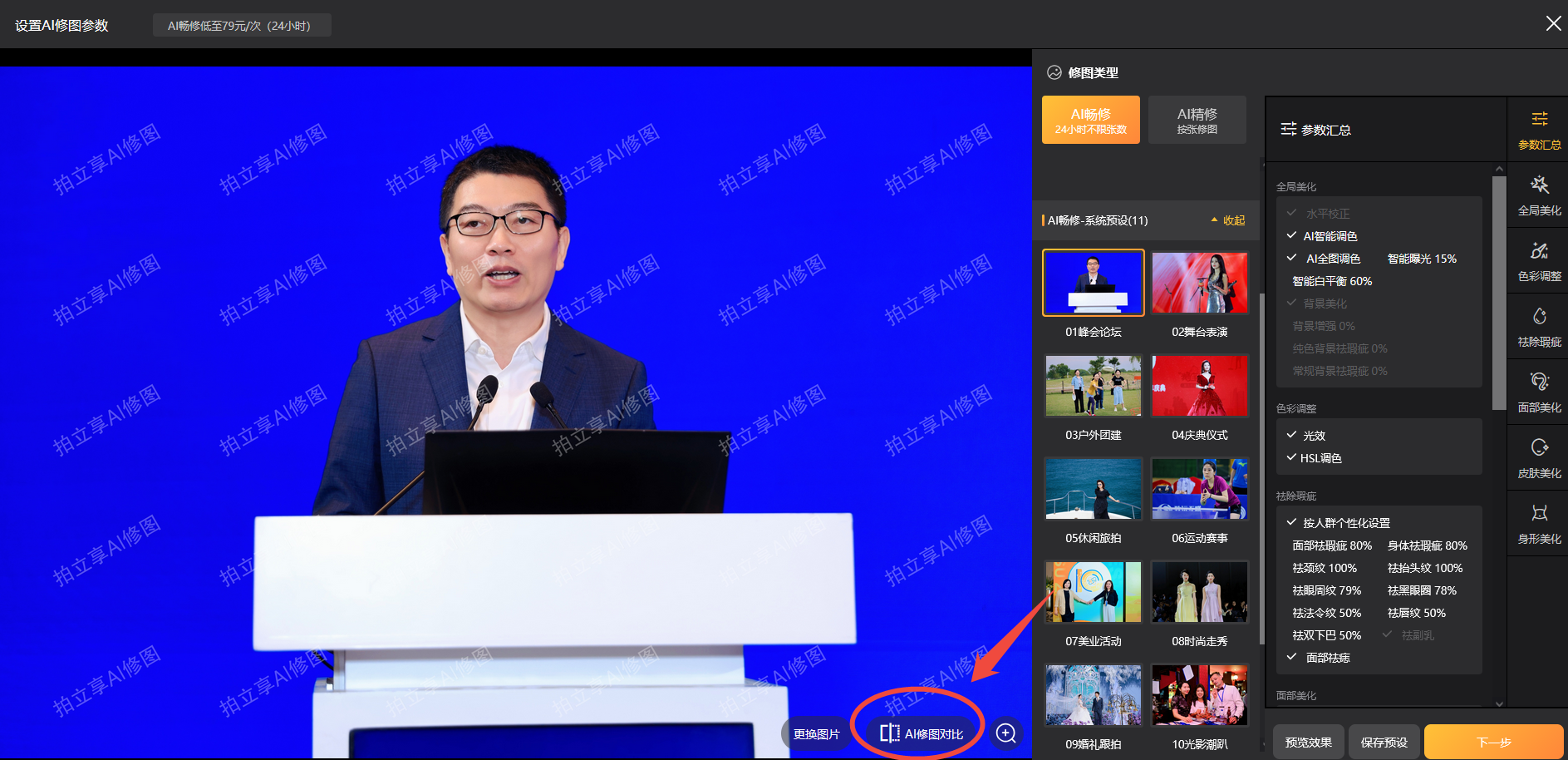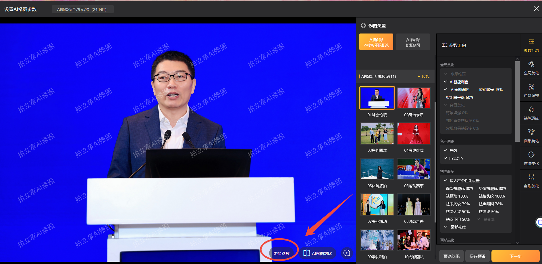 参数确认后→下一步→选择修图时长→开启AI修图→确定开启