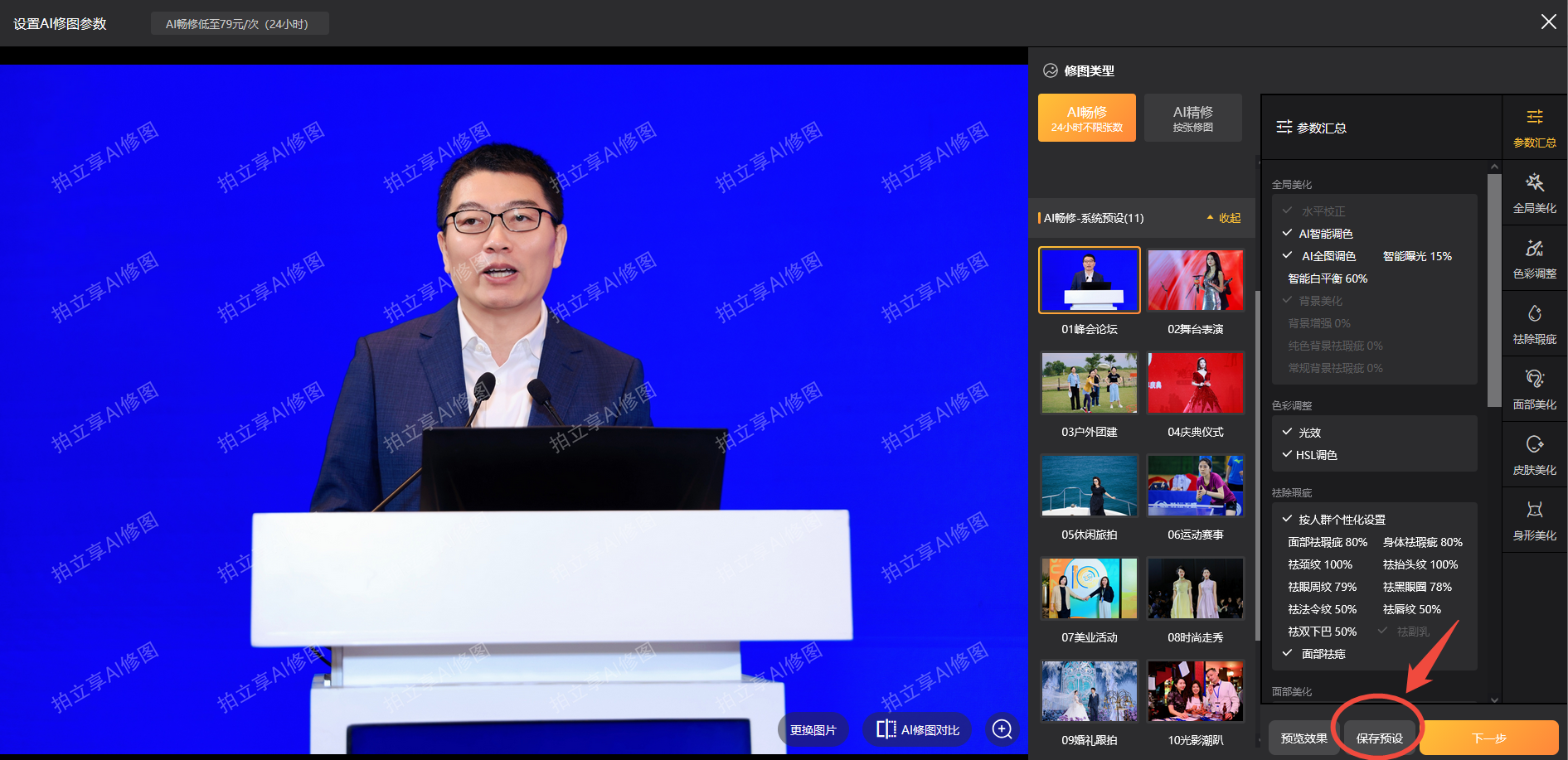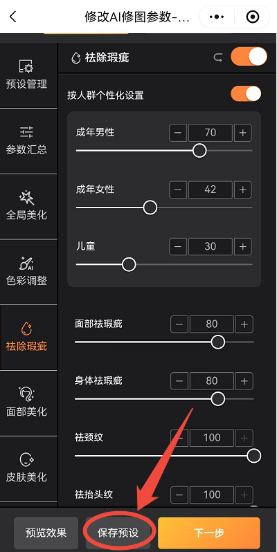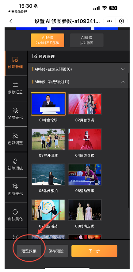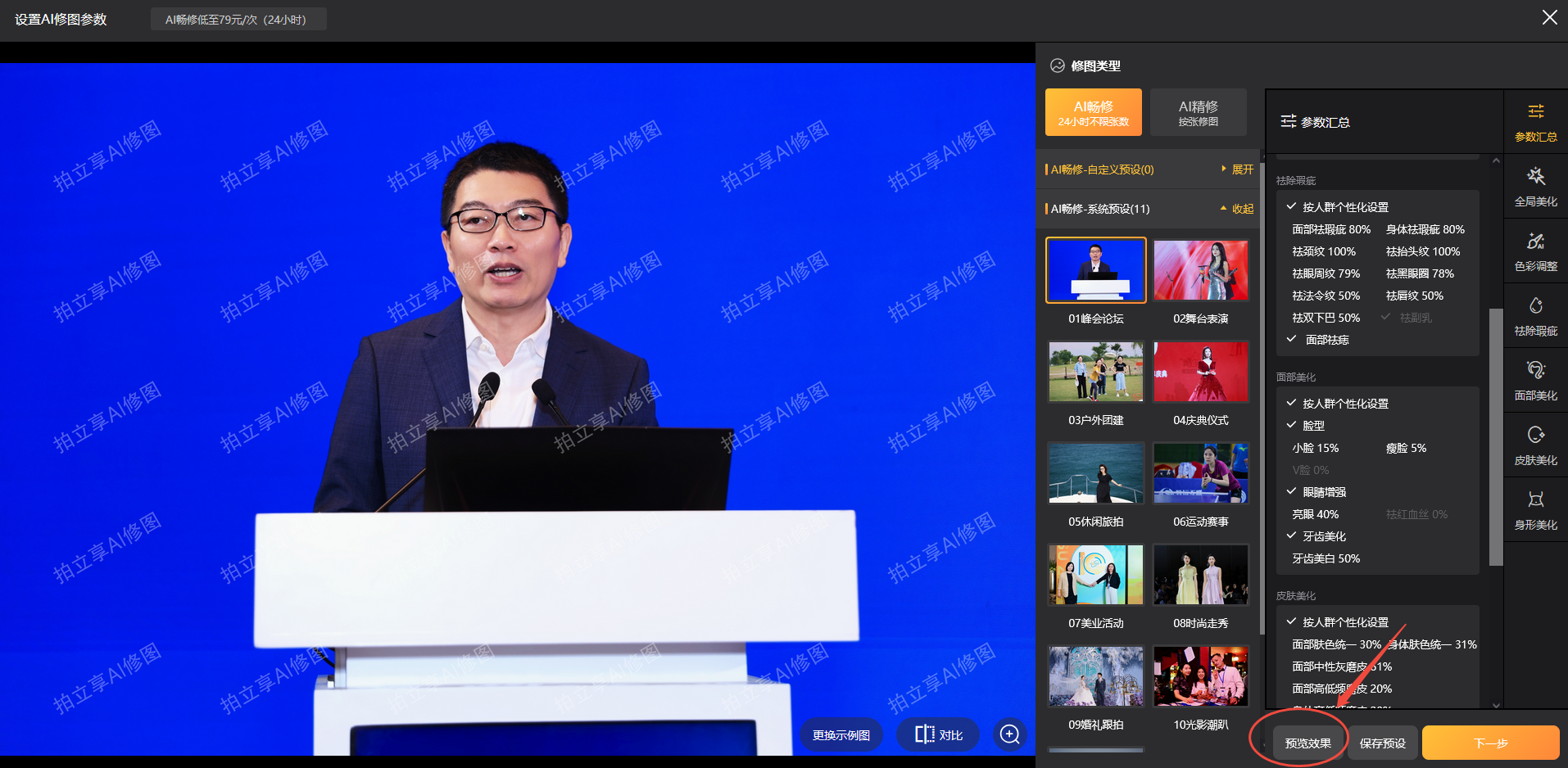 如需预览修改参数后的修图效果,可点击右下角“预览效果”进行预览