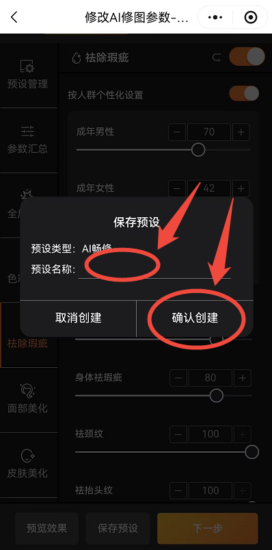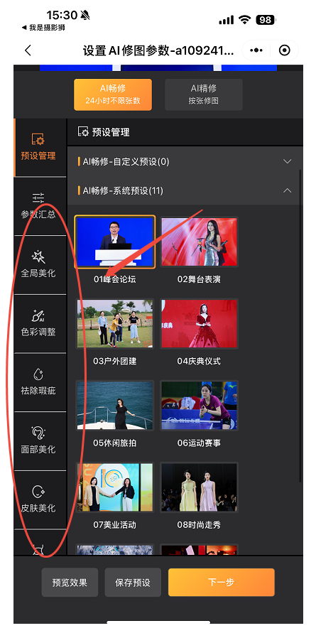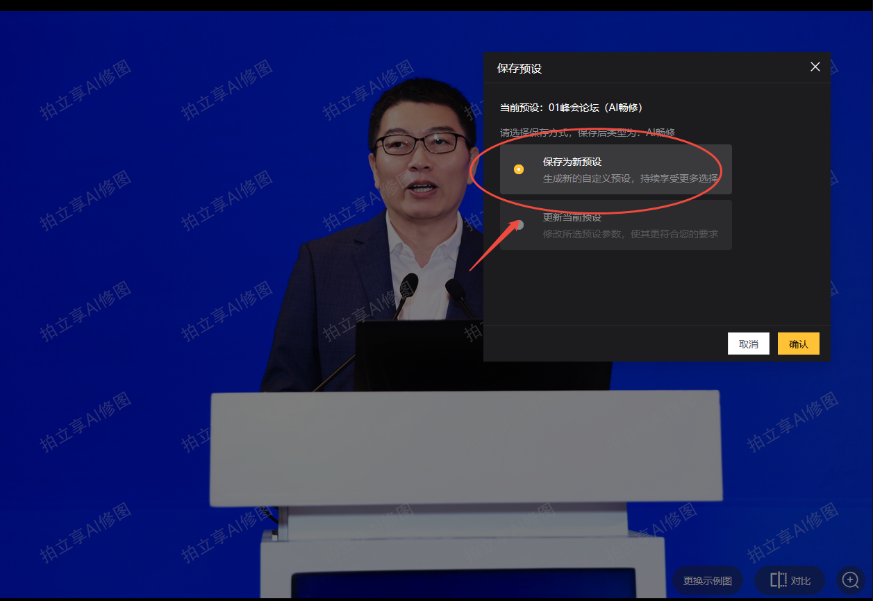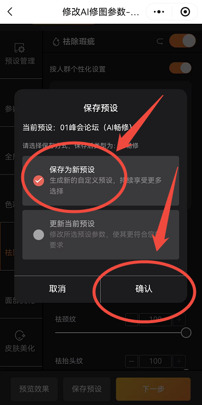 如需将自定义调整后的参数保存供下次活动使用,可点击“保存预设”→选择“保存为新预设”→为自己的预设进行命名(*默认系统预设继续保留无法变更,故此处无法选择“更新当前预设”)
