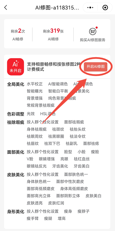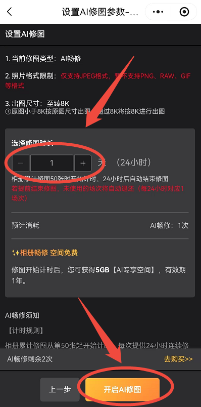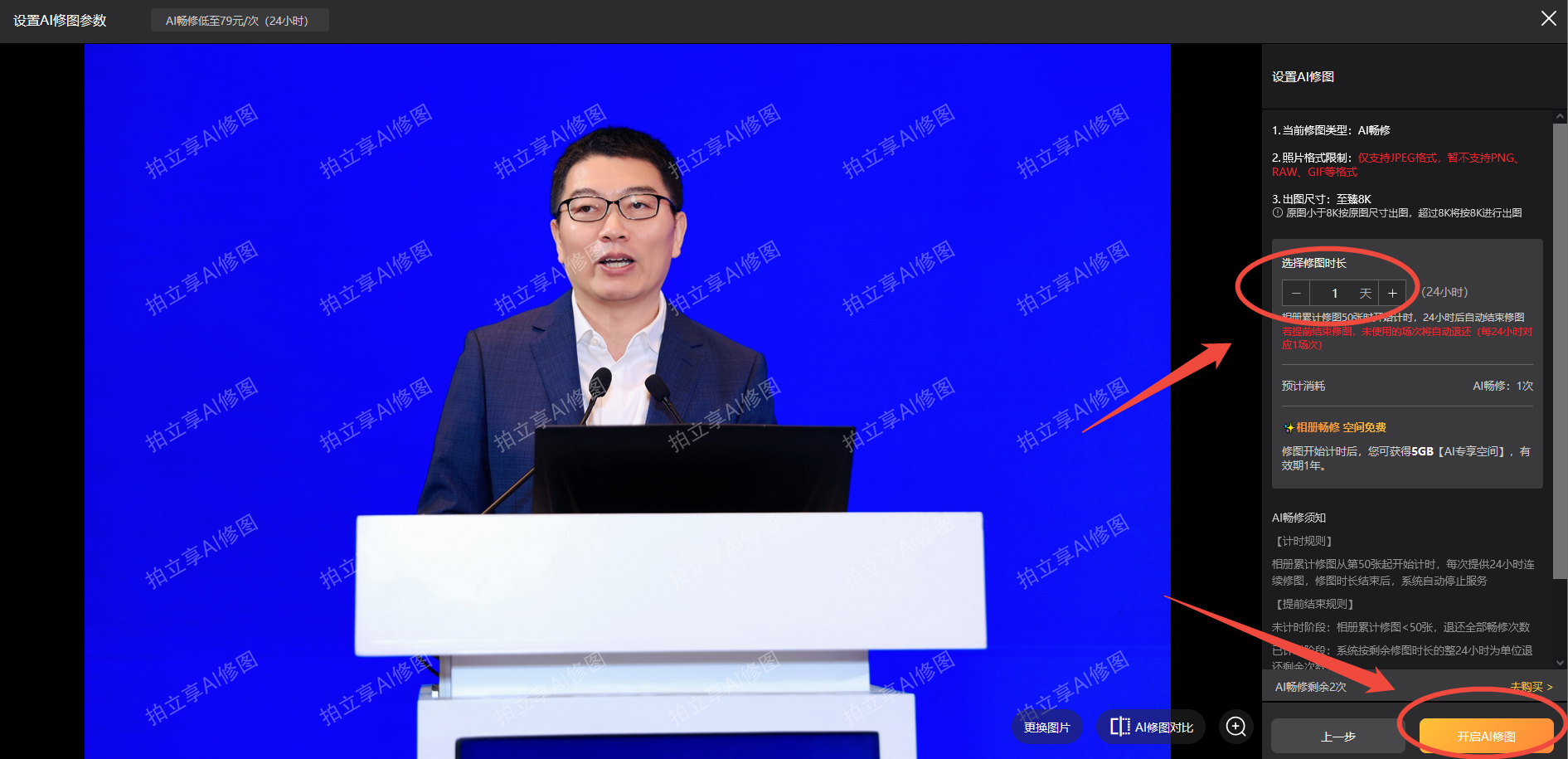 开启AI修图时,先选择修图时长,选择多少天,就扣多少次