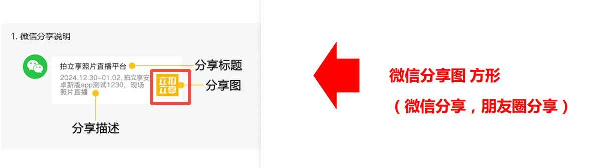 2、分享描述为:微信分享描述 【建议28字以内,如不设置默认格式为:日期+相册名称+现场照片直播@地点】