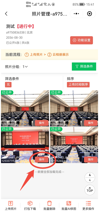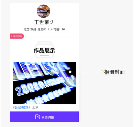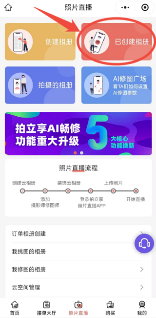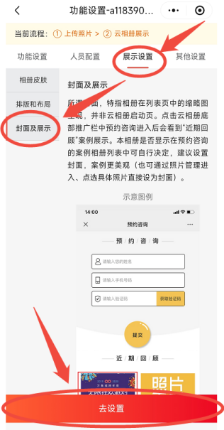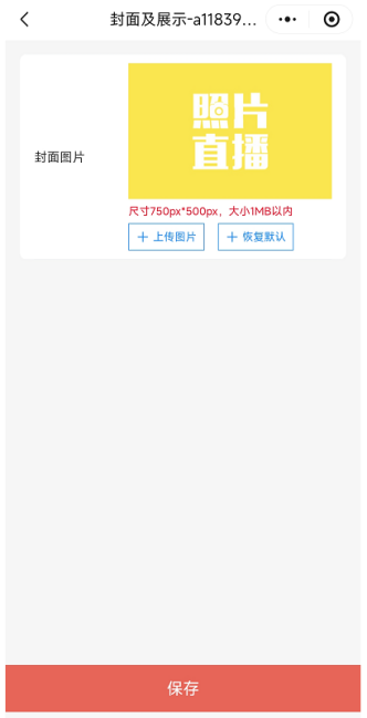 打开“我是摄影狮”小程序→进入“照片直播”→进入“已创建相册”→点击“功能设置”→展示设置→封面和展示→上传照片并保存