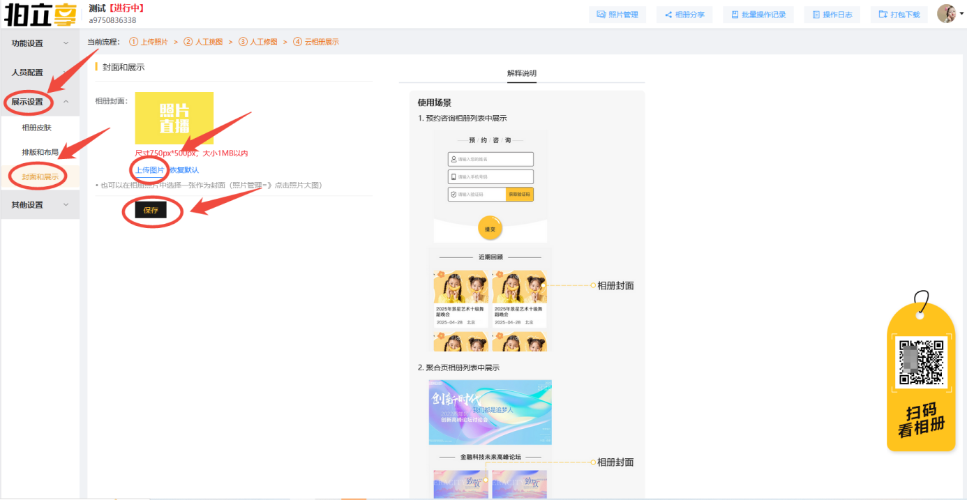 拍立享官网登录个人账号→进入“我创建的相册”→找到对应相册点击“功能设置”→展示设置→封面和展示→上传照片并保存