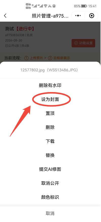 进入相册照片管理→选择想设置的照片右下角“更多”→设为封面