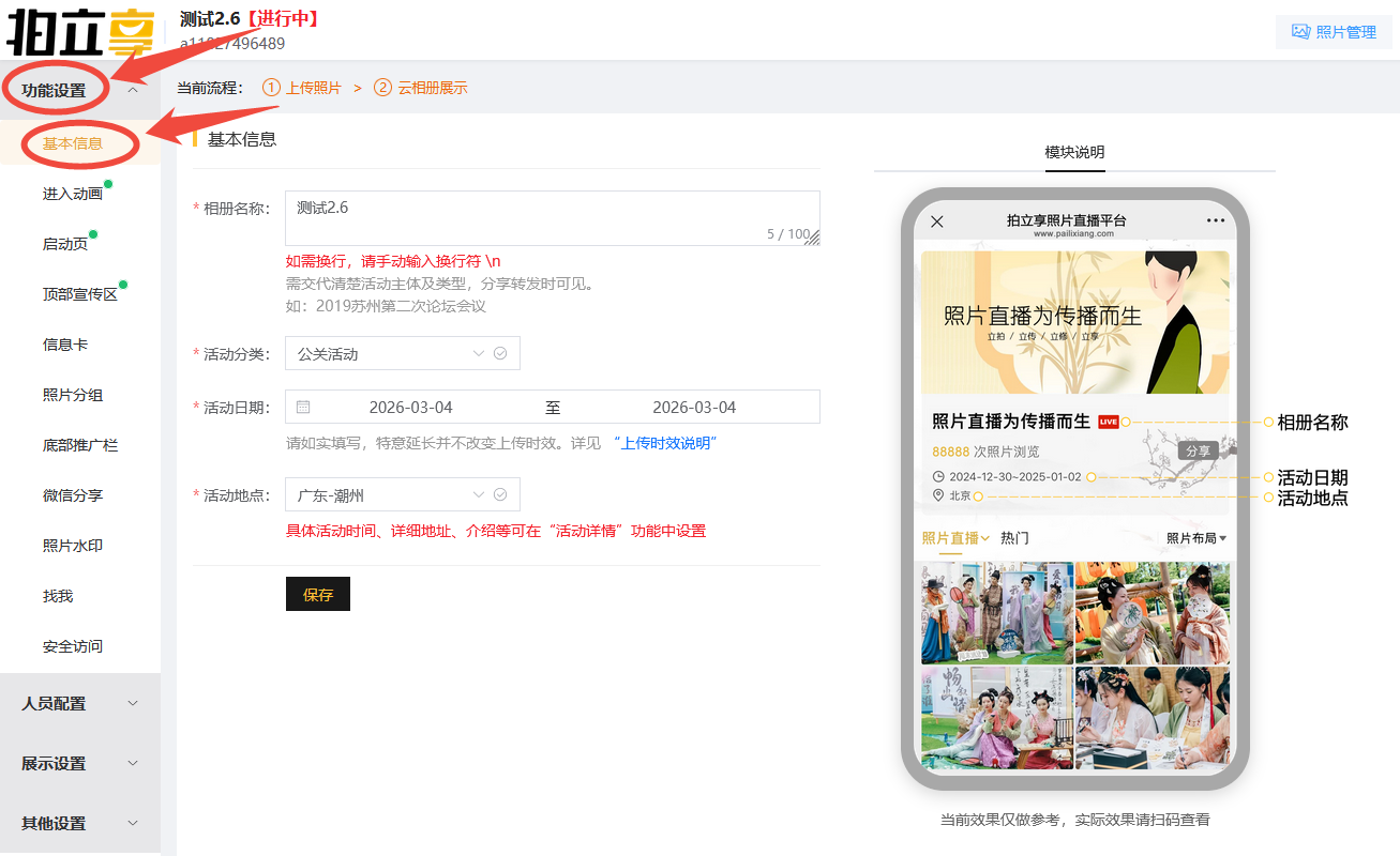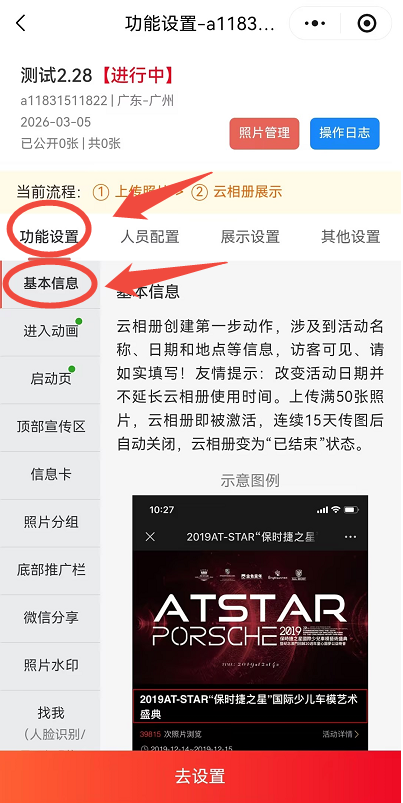 拍立享官网登录个人账号——进入“我创建的相册”——找到对应相册点击“功能设置”——点击“基本信息”
