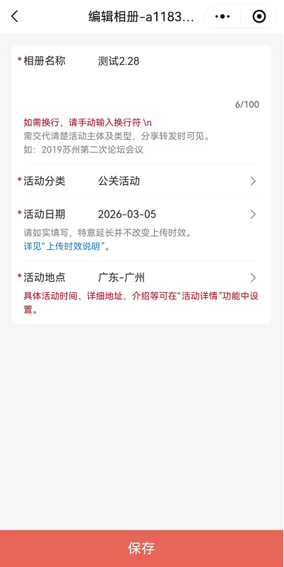 - 相册名称换行,只输入回车换行仅同步微信分享链接,如需打开相册处名称同步换行,需在换行处输入