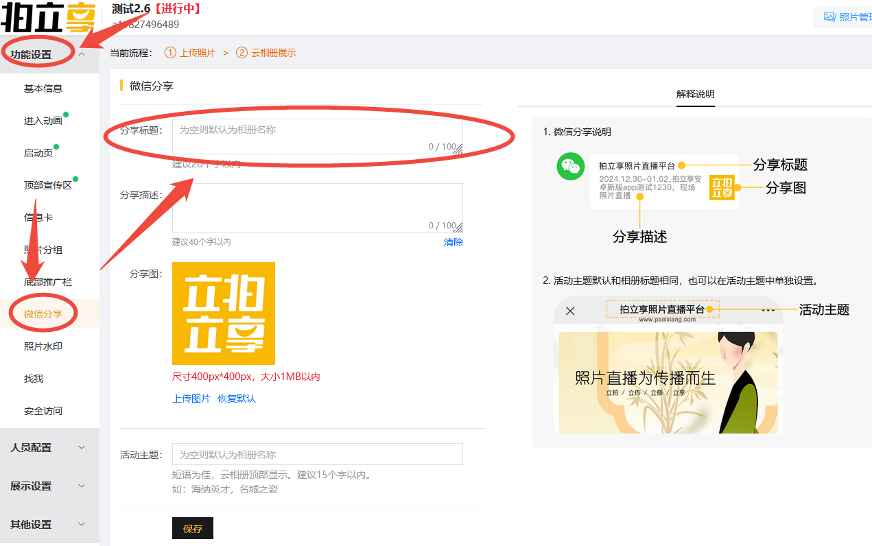 - 相册名称默认同步到微信分享链接的相册名称,如需修改微信分享链接的文字,可另外进入“功能设置——微信分享”进行设置;