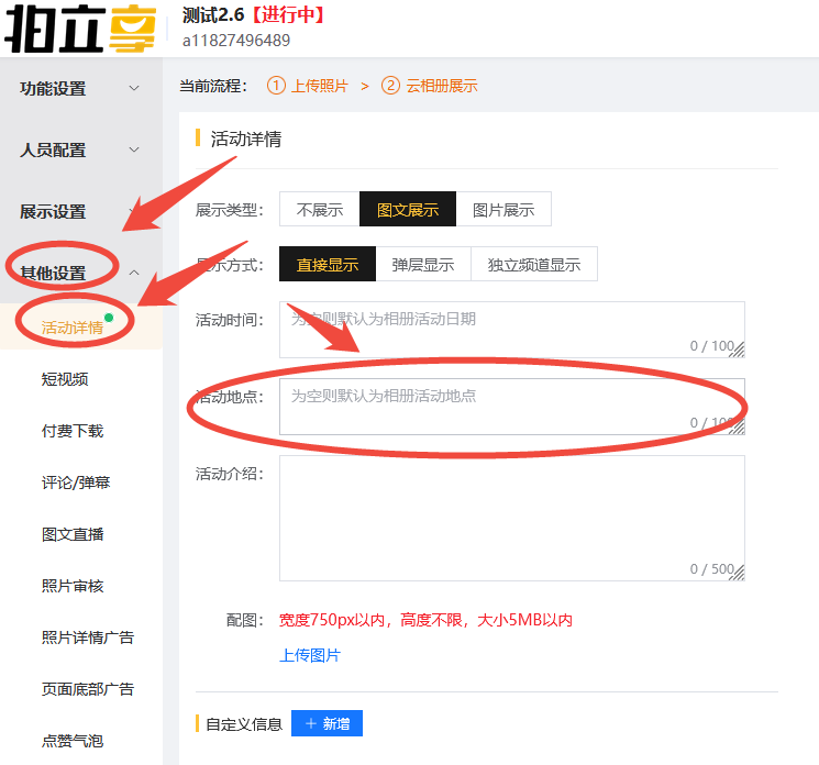 - 如活动地址不在设置选项范围内或需要自定义活动地址,可进入“功能设置——其他设置——活动详情——活动地点”进行设置;