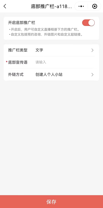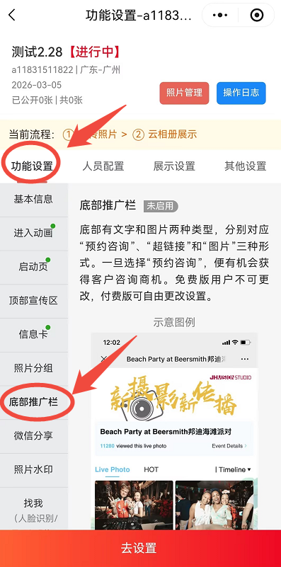 打开“我是摄影狮”小程序→进入“照片直播”→进入“已创建相册”→点击“功能设置”→点击“底部推广栏”→设置后保存