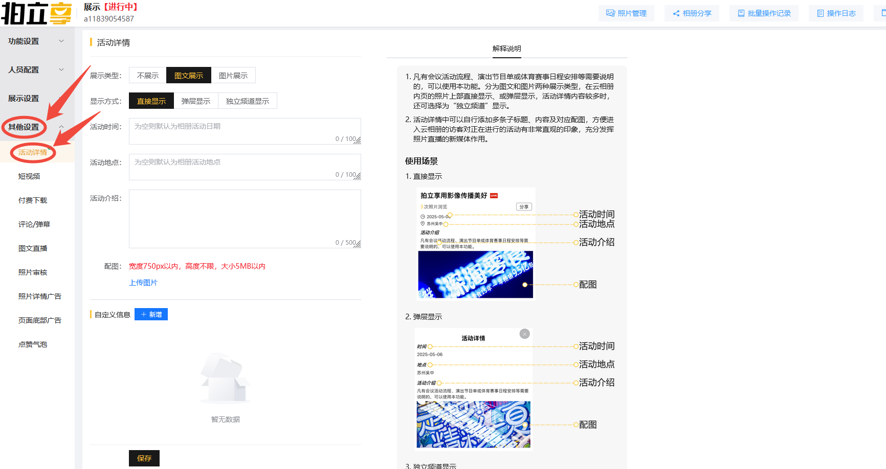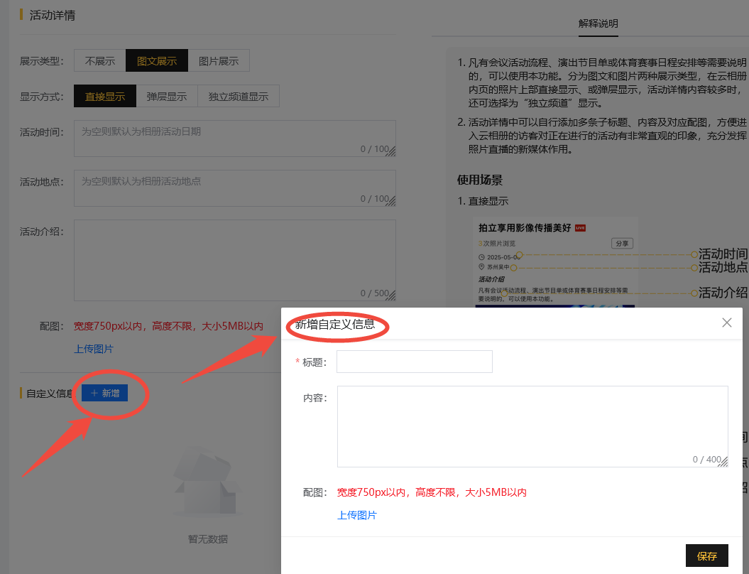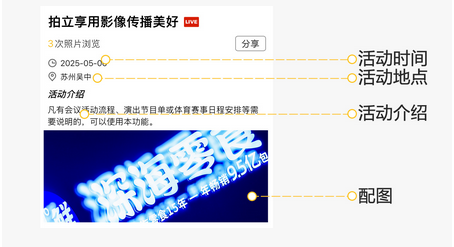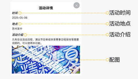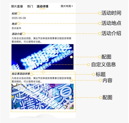 凡有会议活动流程、演出节目单或体育赛事日程安排等需要说明的,可以使用本功能。分为图文和图片两种展示类型,在云相册内页的照片上部直接显示、或弹层显示,活动详情内容较多时,还可选择为“独立频道”显示。