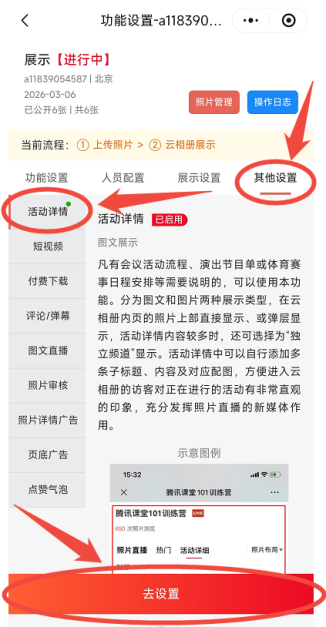 已创建的相册→功能设置→其他设置→活动详情