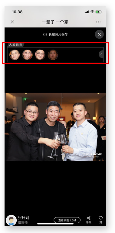 一旦开启后,访客浏览云相册照片大图时,可自动识别出照片中人像,AI毫秒级识别人脸105个关键点定位(眉毛24点,眼睛32点,鼻子6点,嘴巴34点,外轮廓9点)。点击所识别出的头像,可以将其相关照片自动归集。