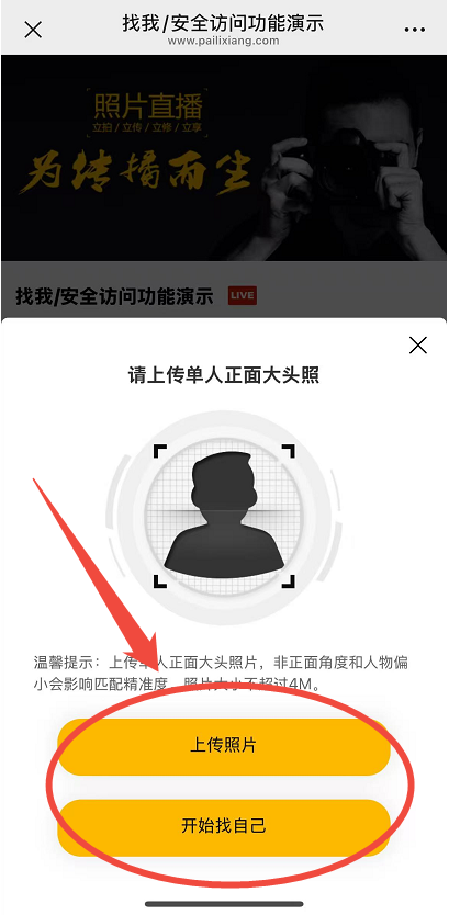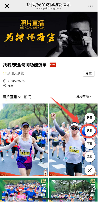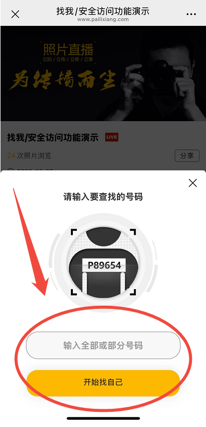 开启后,可以在直播相册根据号码查找照片,可在相册链接右侧点击“找我”,输入全部或部分号码(只适用于3-8位且包含数字的号码),然后点击“开始找自己”,即可找到相册内所有自己的照片。