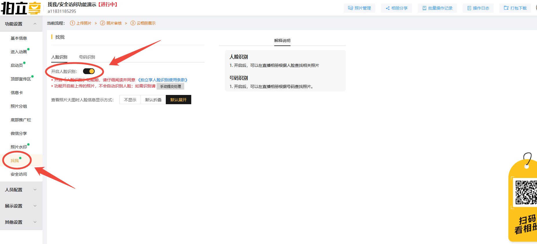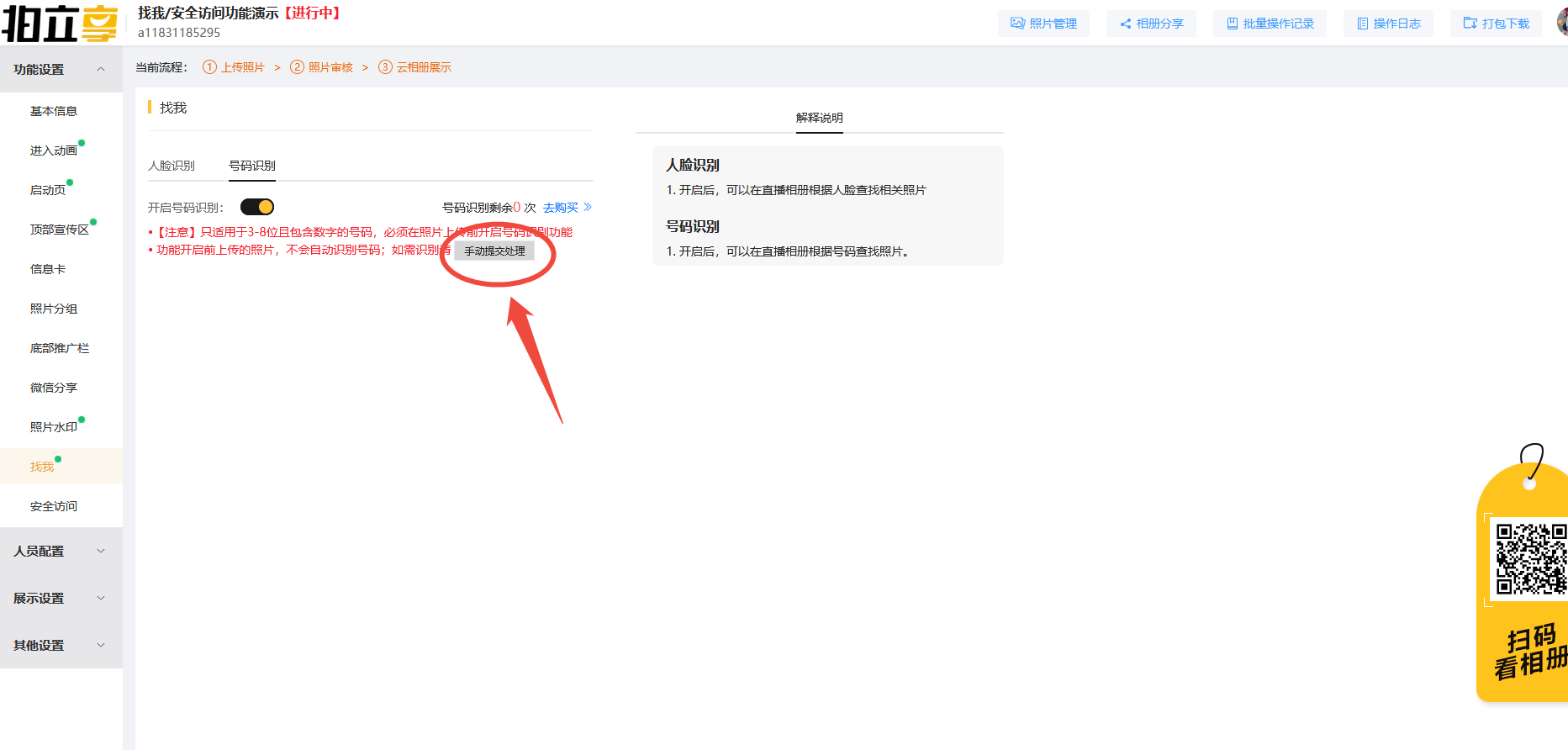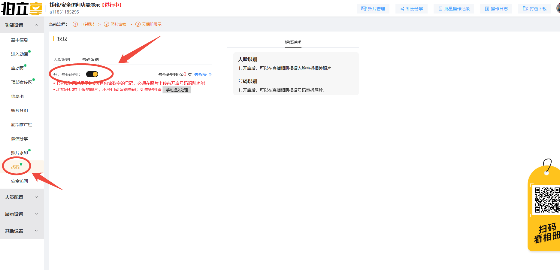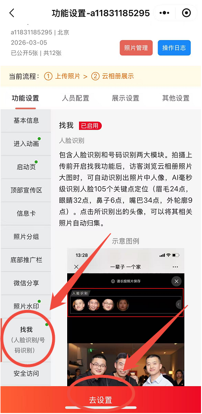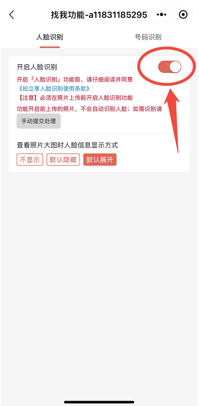 拍立享官网登录个人账号→进入“我创建的相册”→找到对应相册点击“功能设置”→找我→开启号码识别。