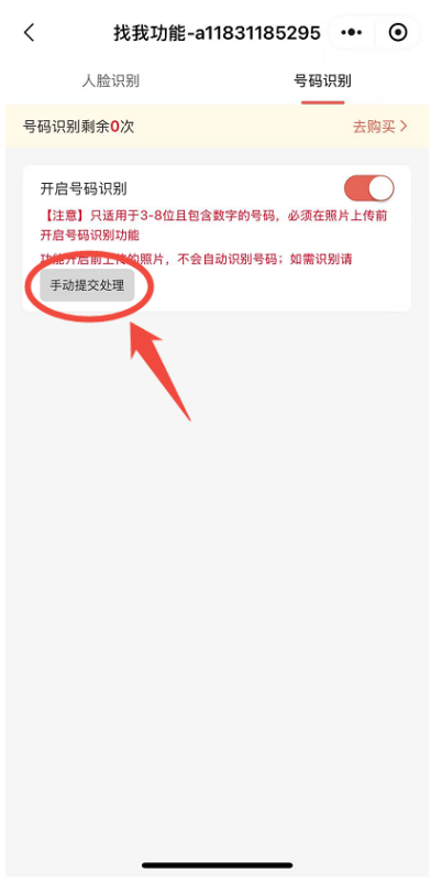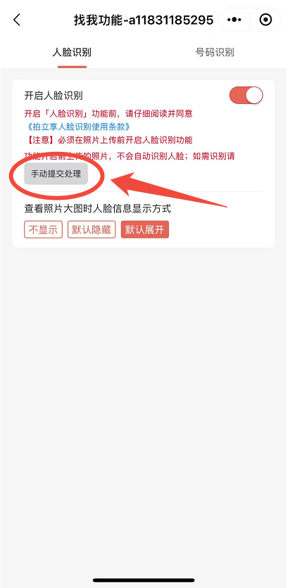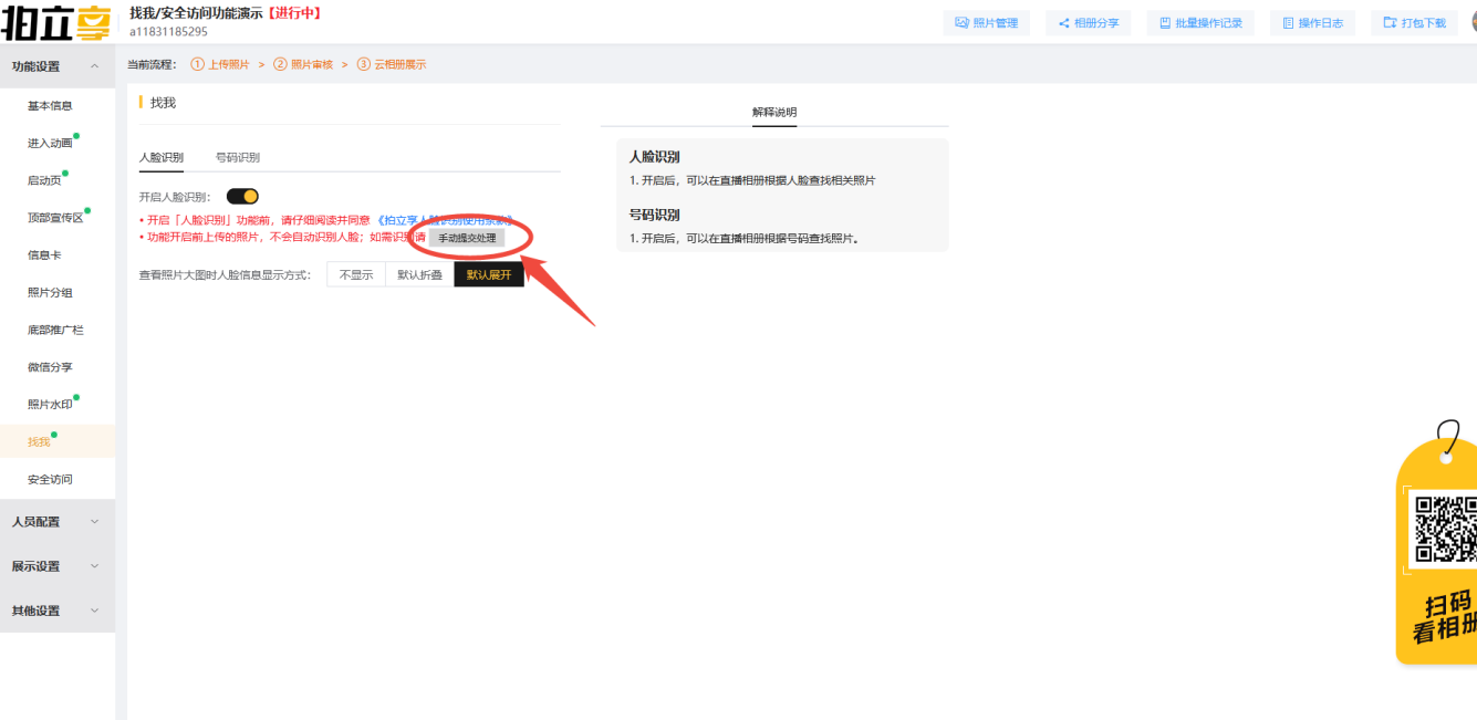 【注意】 必须在照片上传前开启人脸识别功能,功能开启前上传的照片,不会自动识别人脸,如需识别需点击“手动提交处理”。