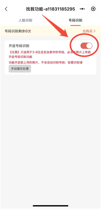 【注意】 必须在照片上传前开启号码识别功能,功能开启前上传的照片,不会自动识别号码,如需识别需点击“手动提交处理”。可在相册链接右侧点击“找我”,输入全部或部分号码,然后点击“开始找自己”,即可找到相册内所有自己的照片。