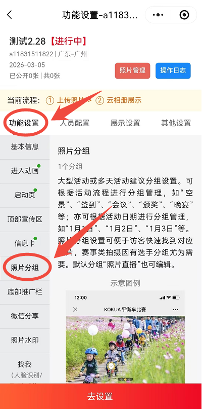 打开“我是摄影狮”小程序→进入“照片直播”→进入“已创建相册”→点击“功能设置”→点击“照片分组”→设置后保存