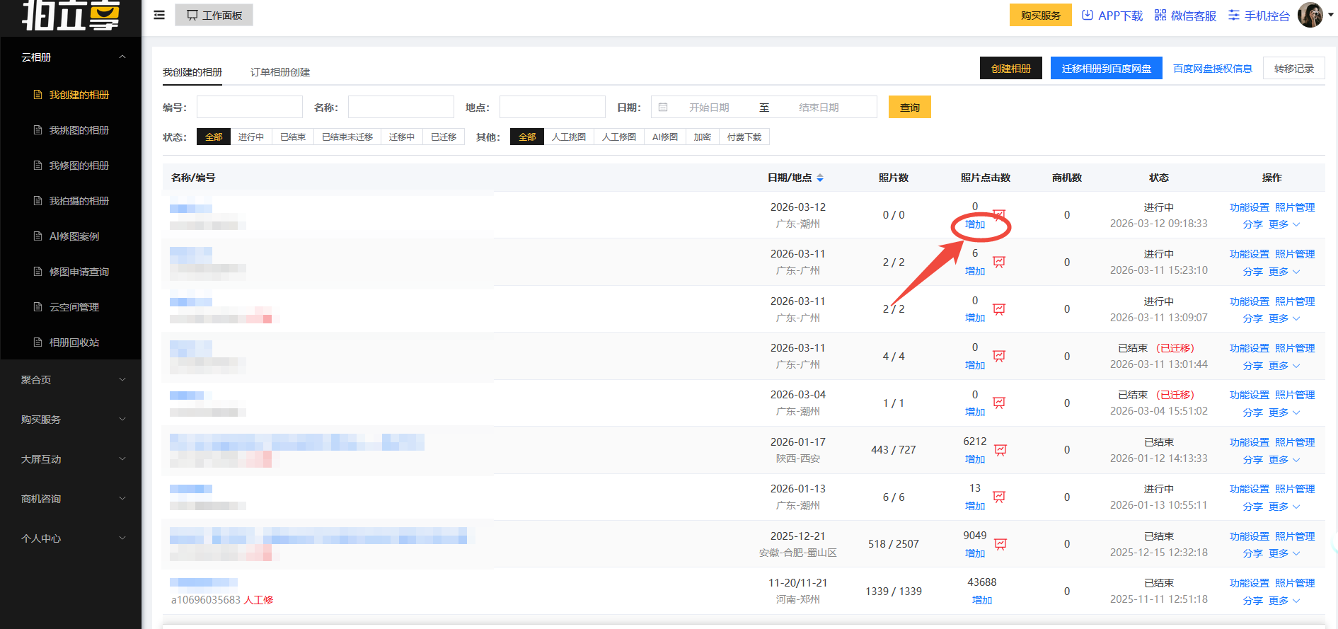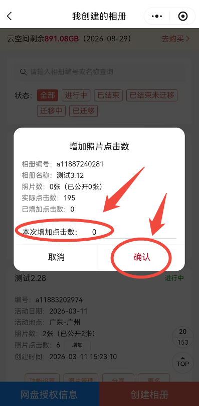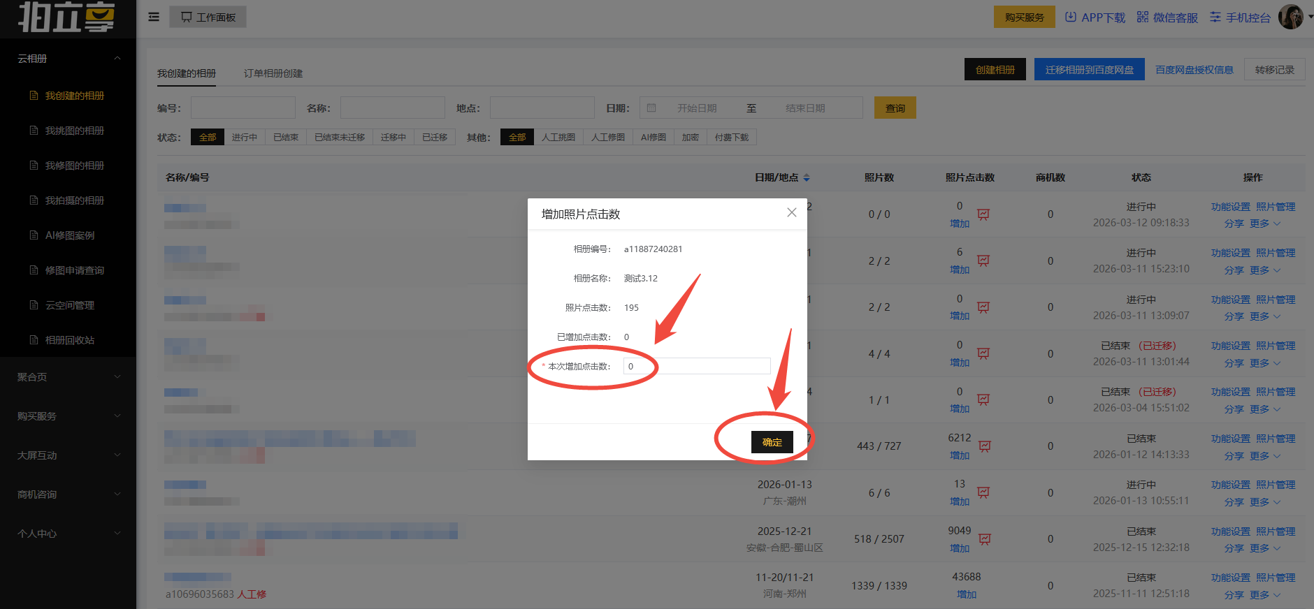 拍立享官网登录个人账号→在“我创建的相册”界面→找到要增加浏览量的相册→照片点击数→输入需要增加的数量→确认