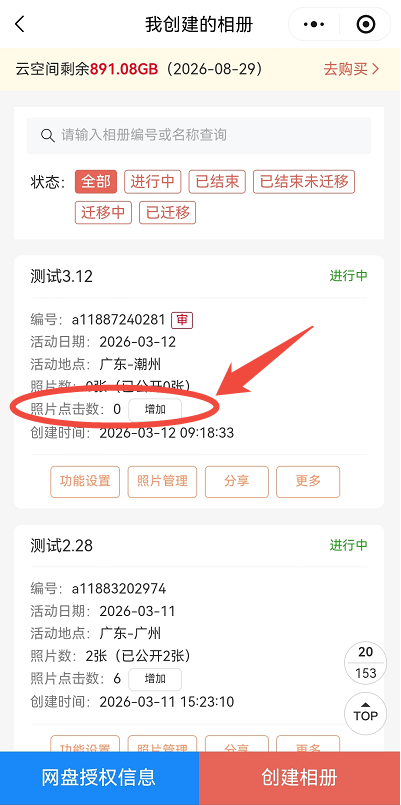 增加的数量只在前端云相册中体现,管理端后台不显示