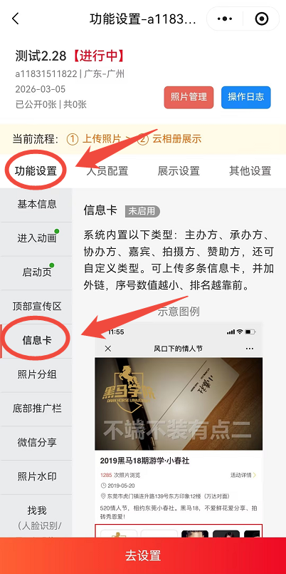 打开“我是摄影狮”小程序→进入“照片直播”→进入“已创建相册”→点击“功能设置”→点击“信息卡”→设置后保存