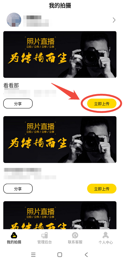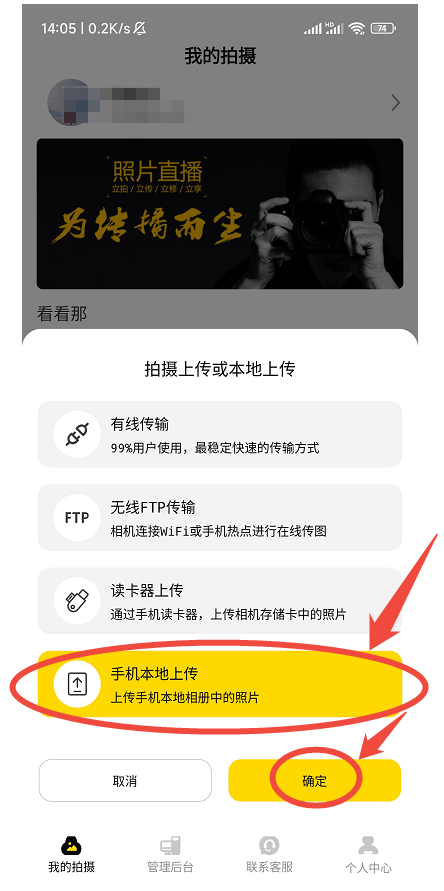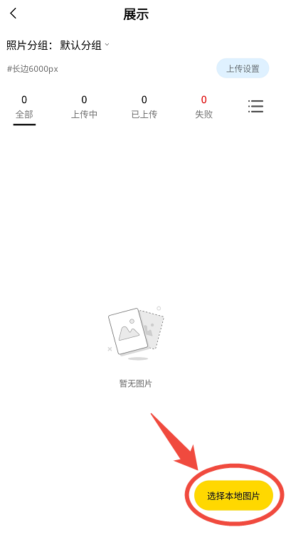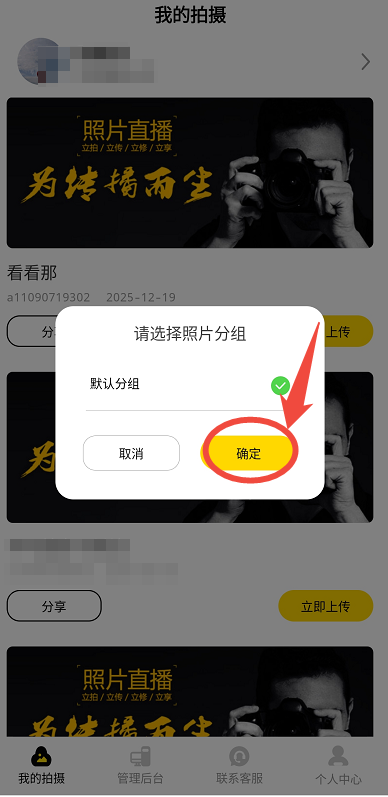 拍立享照片直播APP→立即上传→手机本地上传→选择分组→选择本地图片