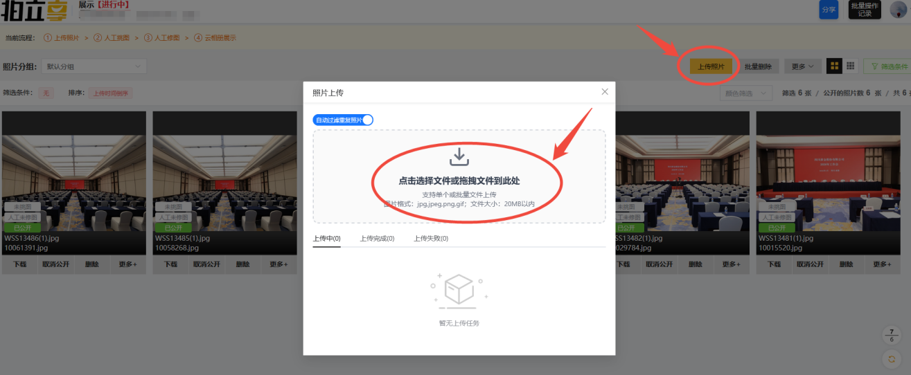 【上传后不压缩,照片多大传上来就多大,限制每张照片大小不能超过20MB】