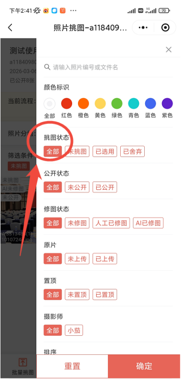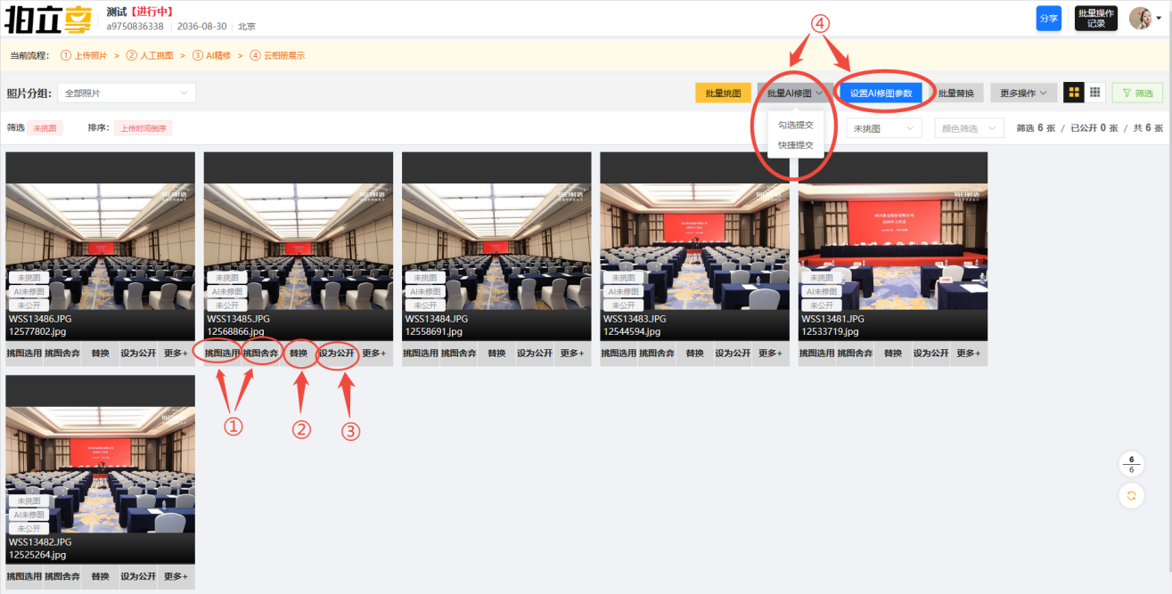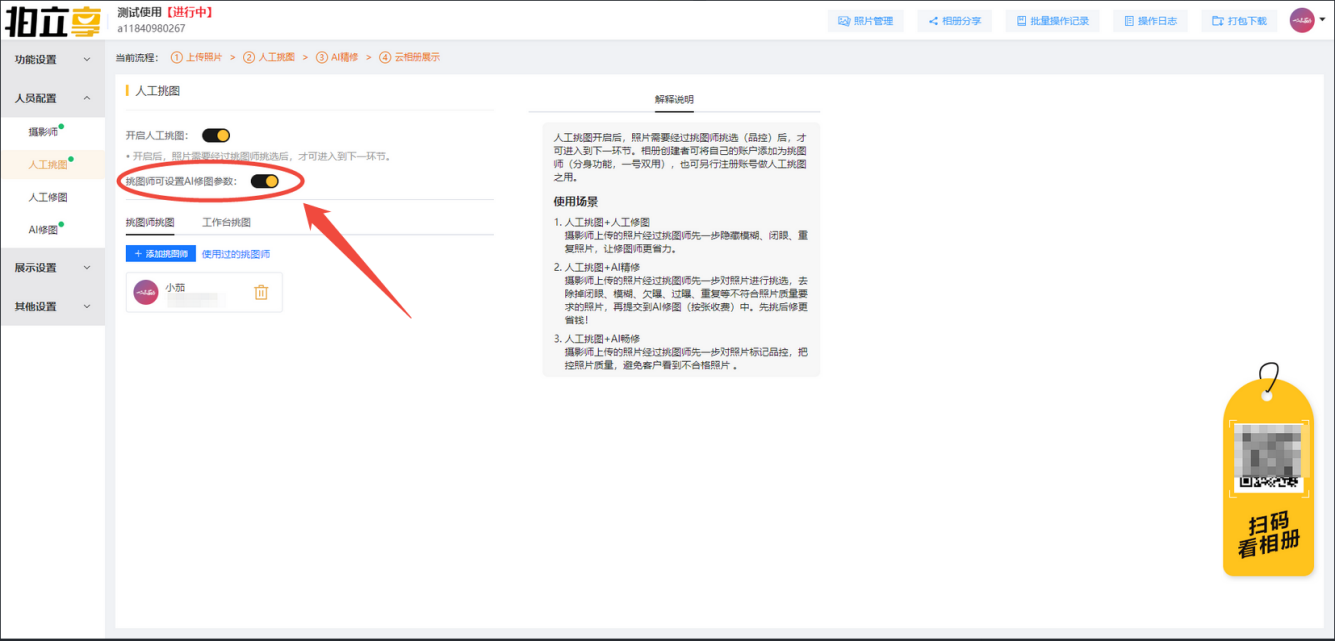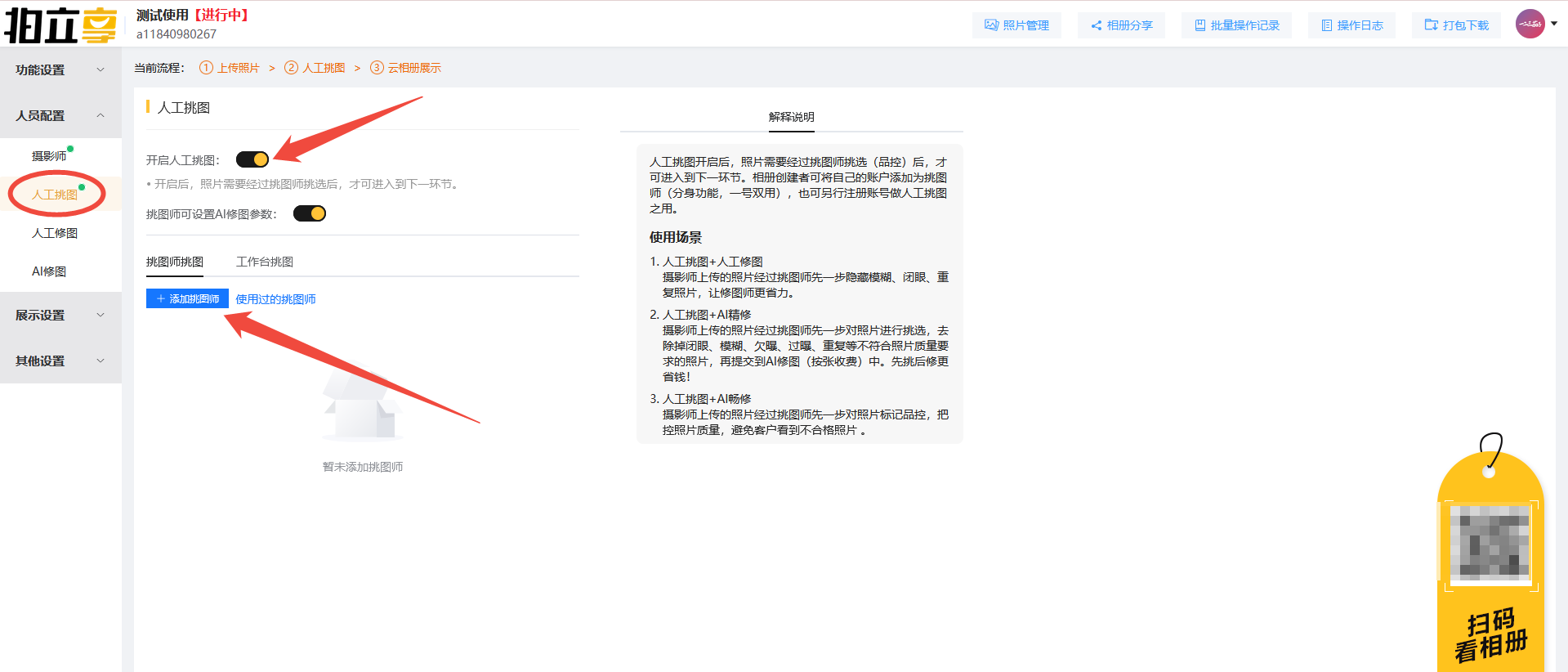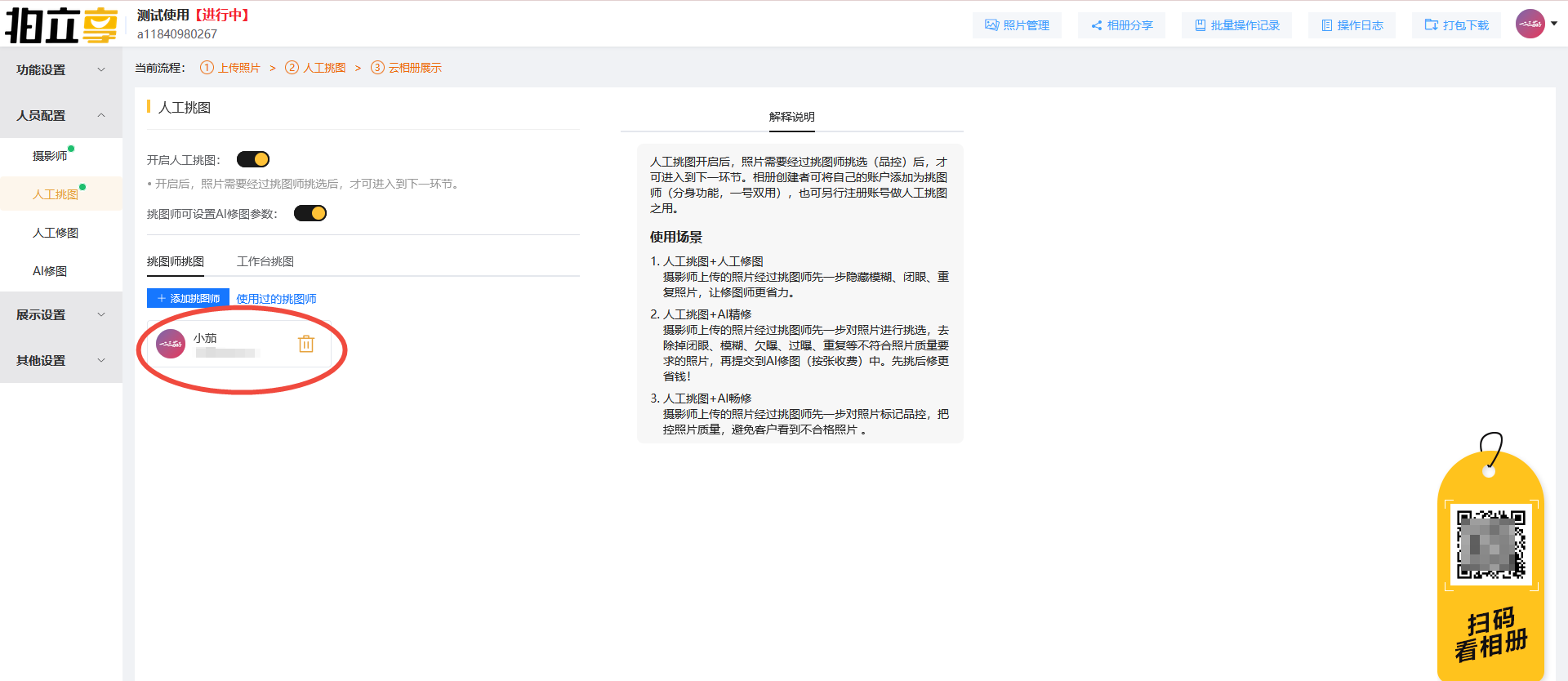 人工挑图开启后,照片需要经过挑图师挑选(品控)后,才可进入到下一环节。相册创建者可将自己的账户添加为挑图师(分身功能,一号双用),也可另行注册账号做人工挑图之用。