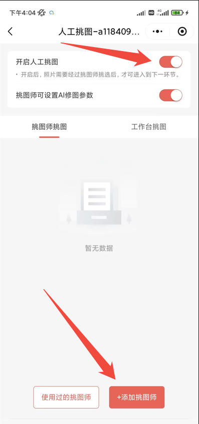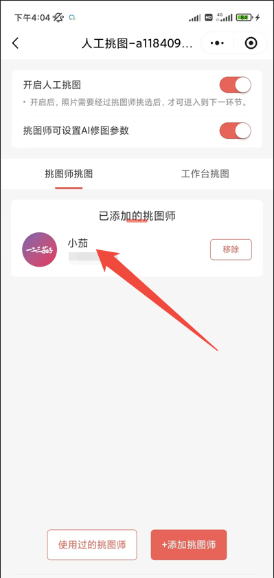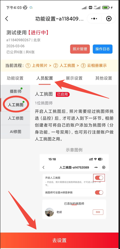 打开“我是摄影狮”小程序→进入“照片直播”→进入“已创建相册”→点击“功能设置”→人员配置→人工挑图→添加挑图师