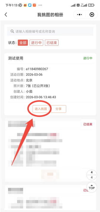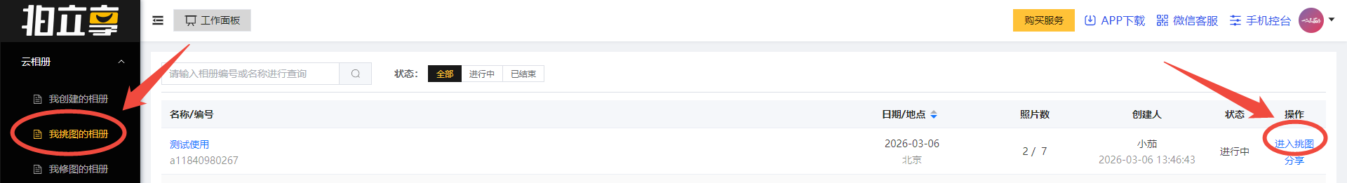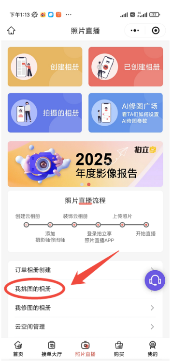修图师进入拍立享官网登录个人账号→进入“我挑图的相册”→进入挑图→对照片进行选用或者舍弃