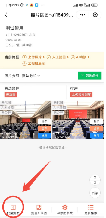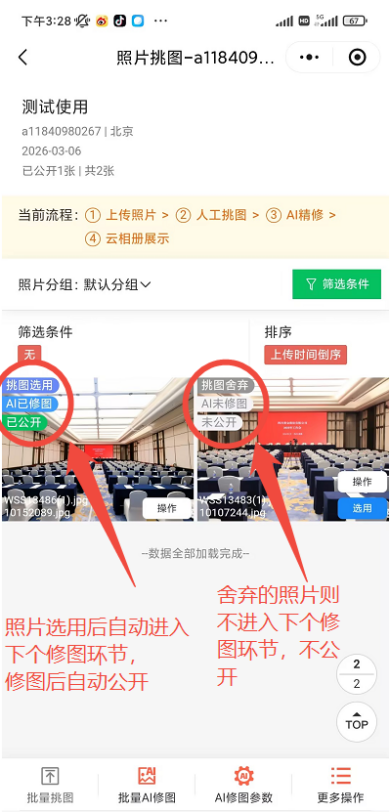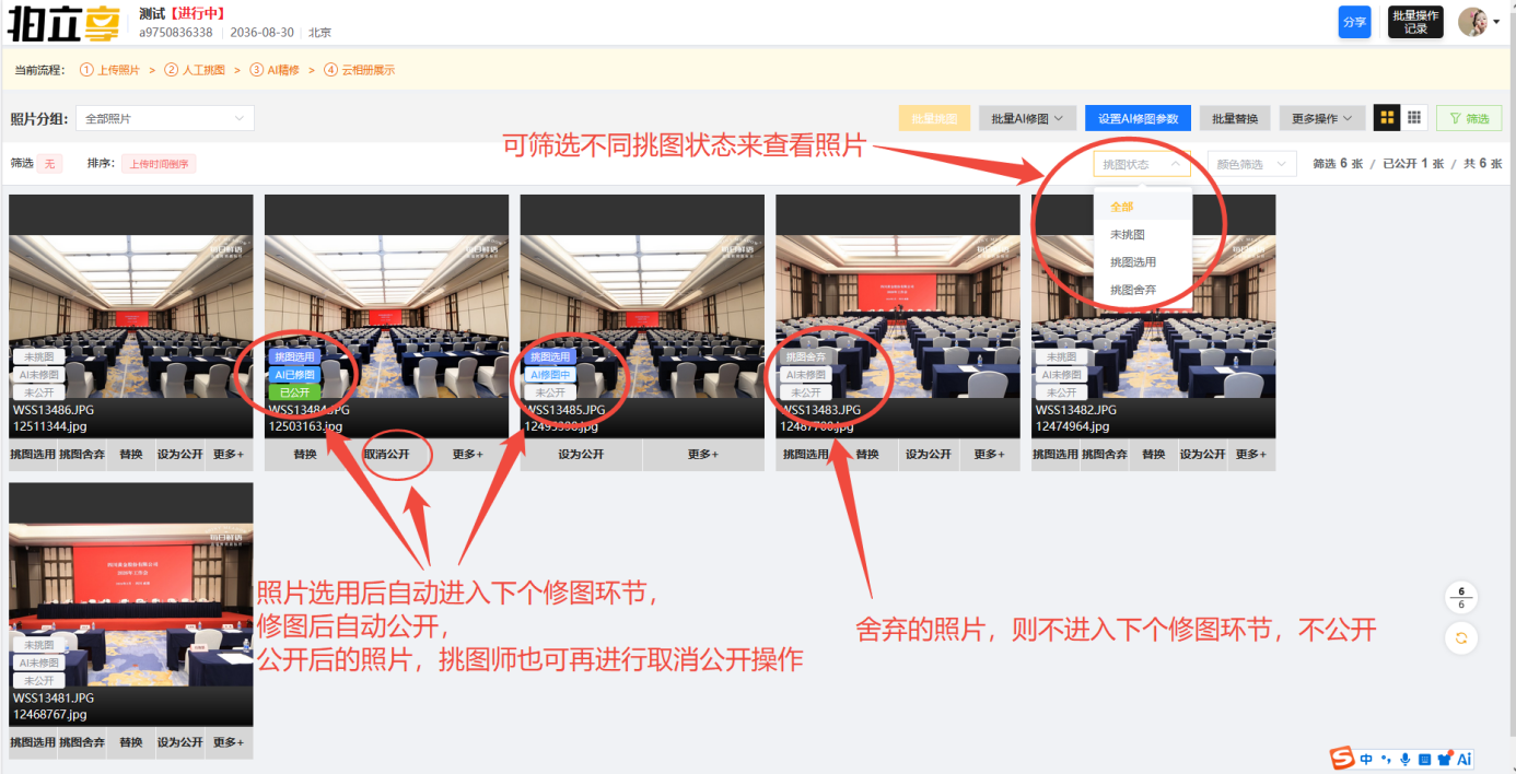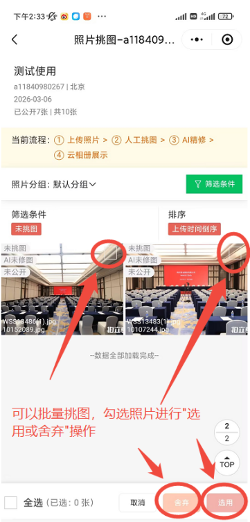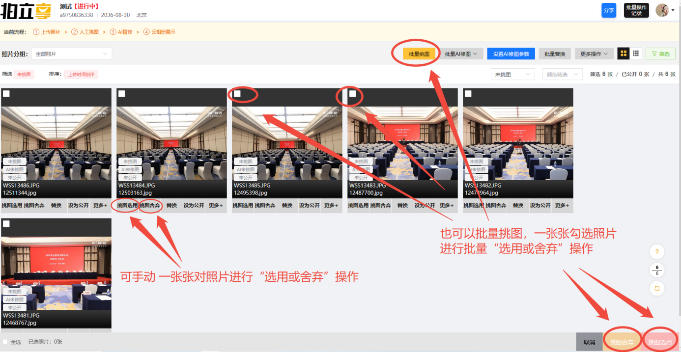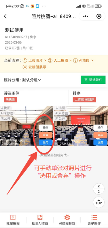 对照片进行筛选,把控照片质量,选用的照片会进入下一步操作(人工修图或AI精修或AI畅修)