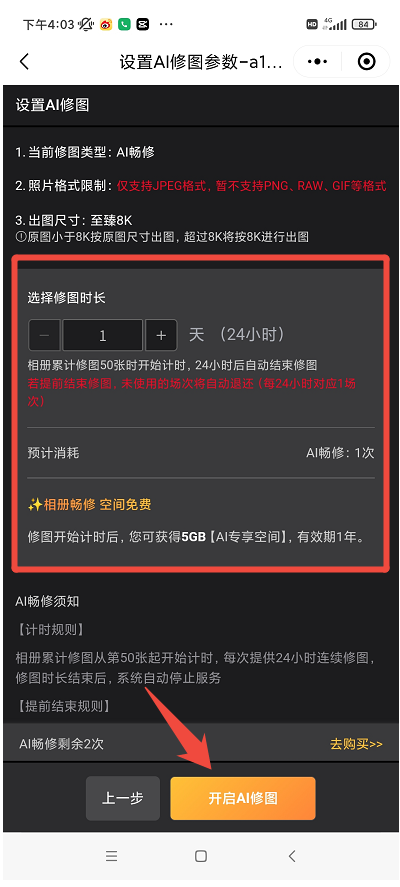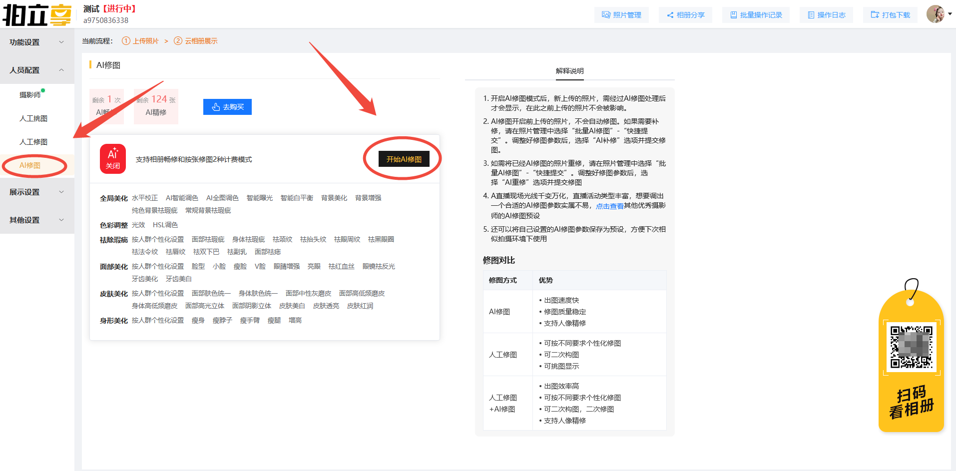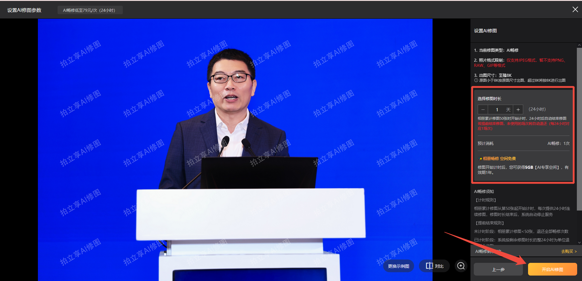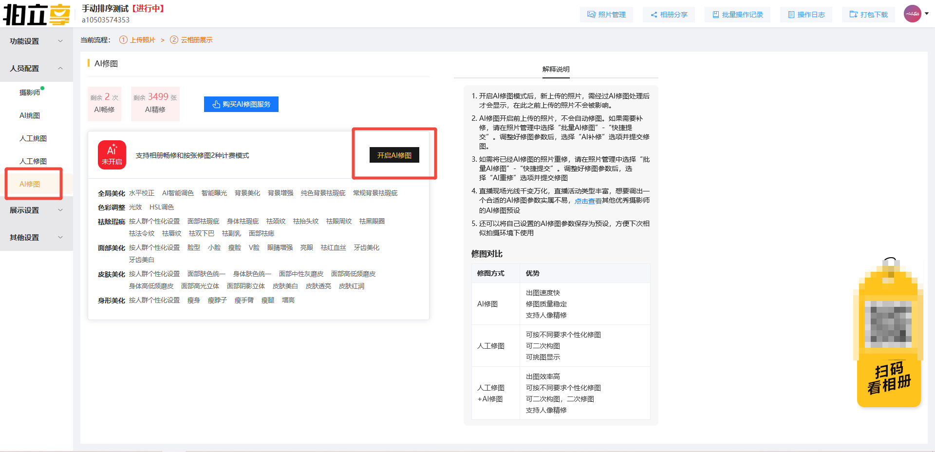 先开启AI畅修: 云相册→功能设置→人员配置→AI修图→去设置→开启AI修图→选择AI畅修模块→设置好参数→下一步→选择修图时长→开启AI修图