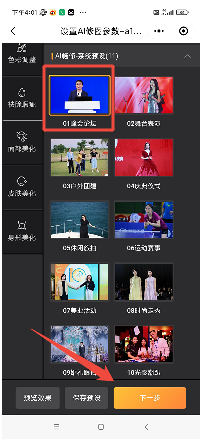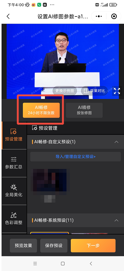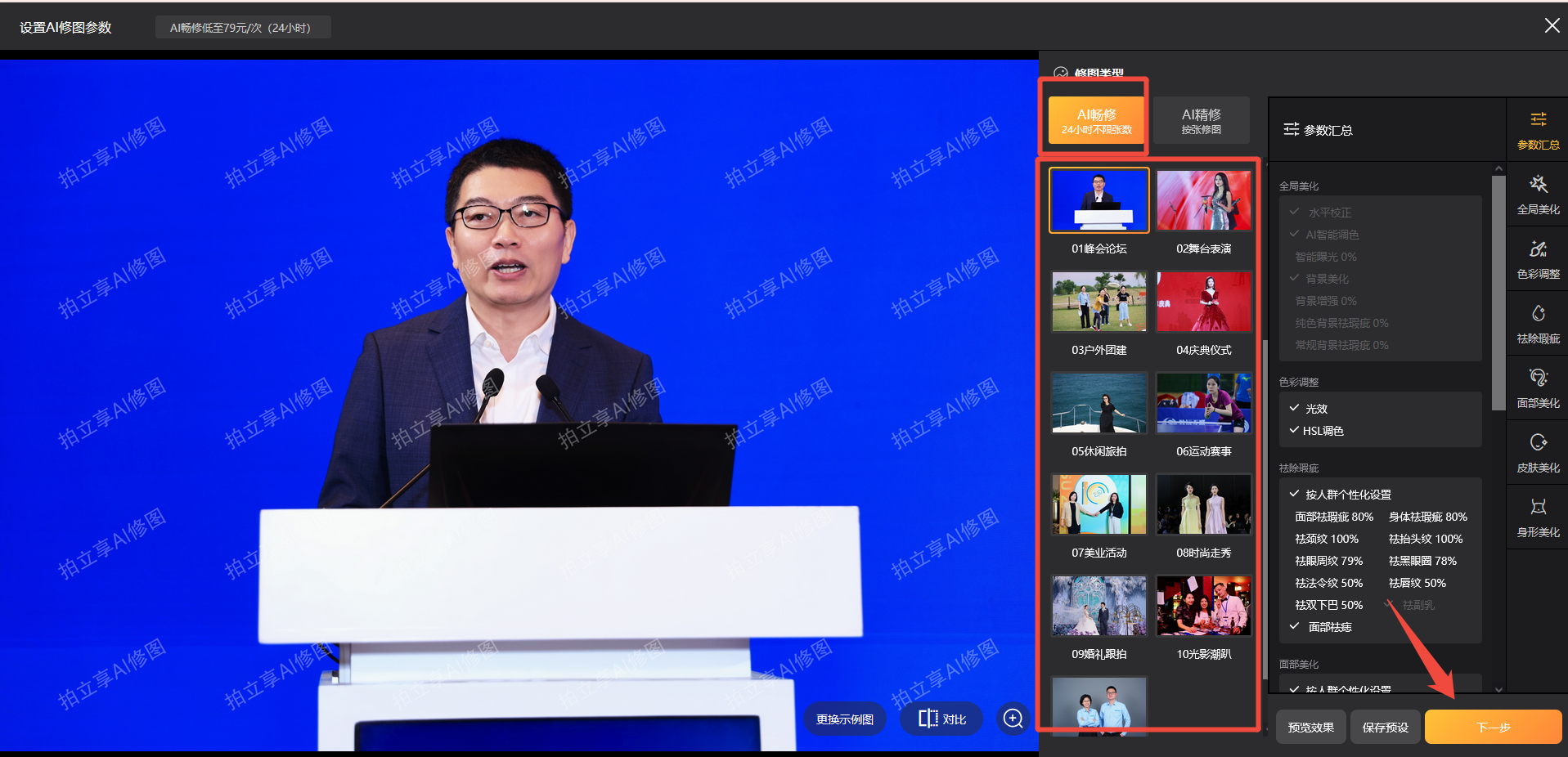 | 选择AI畅修 | 选设置好参数→下一步 | 选择修图时长→开启AI修图 |