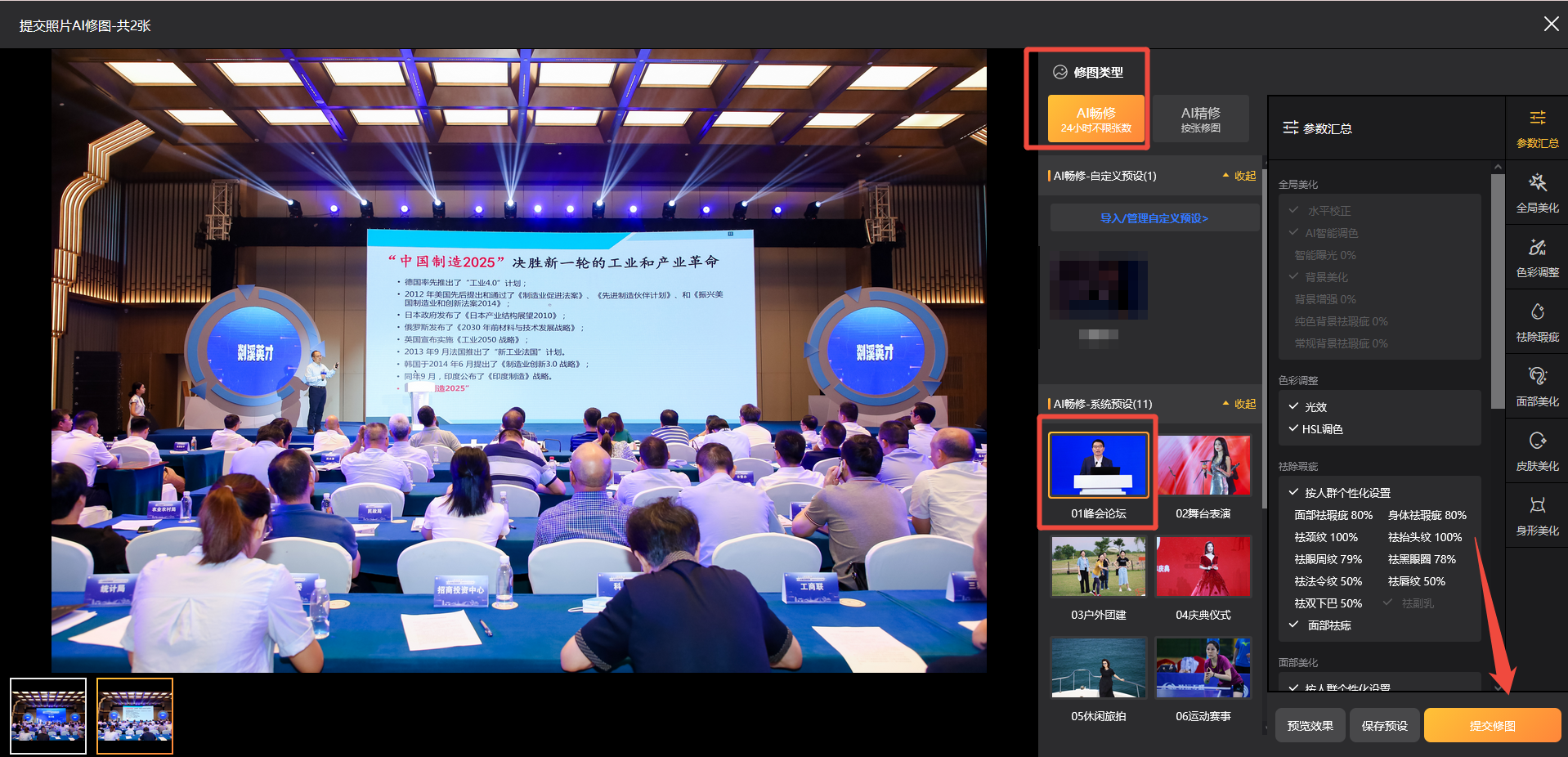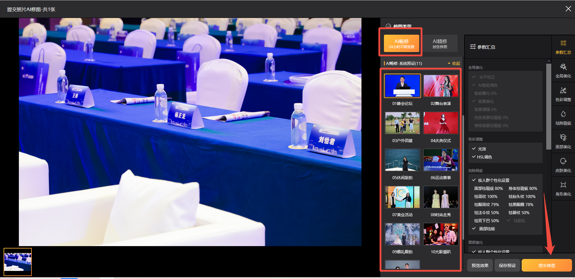 | 勾选需要提交AI畅修的照片→确定提交 | 开择AI畅修模块→设置好参数→提交修图 |