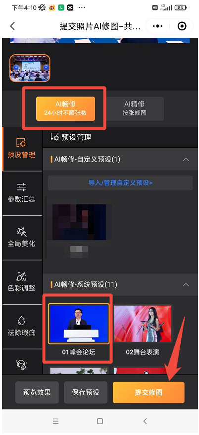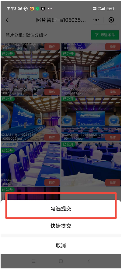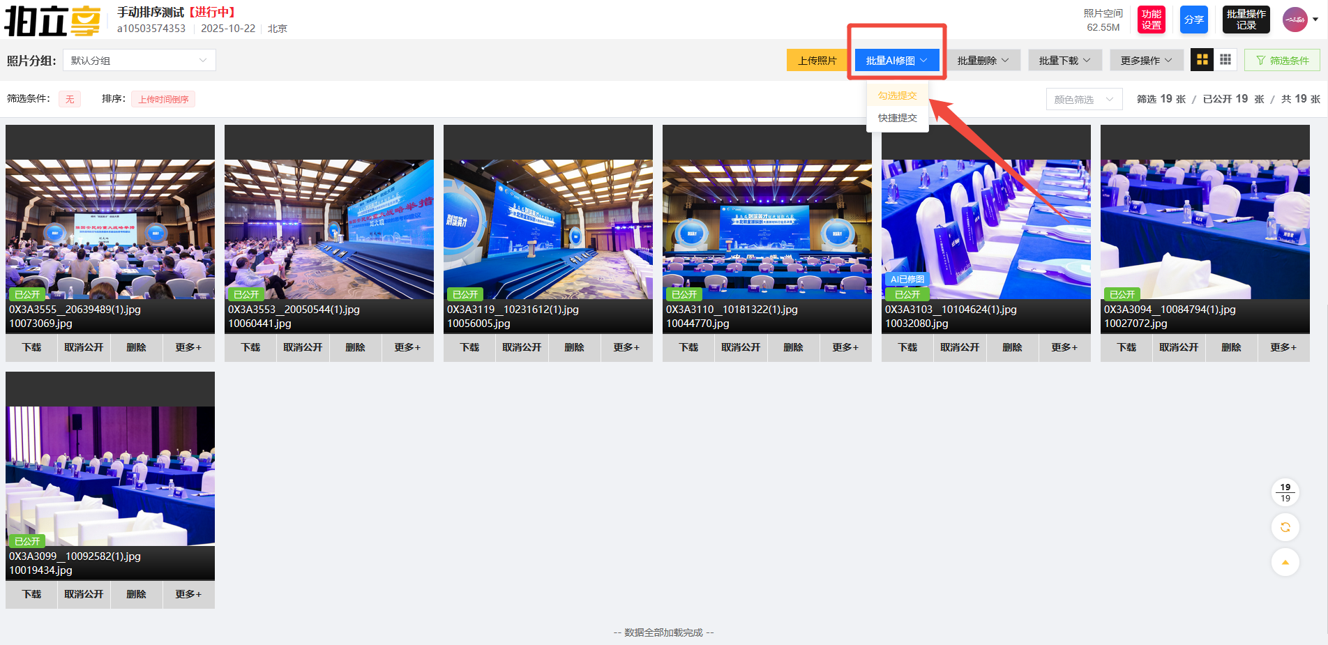 手动多张照片提交: 进入云相册→照片管理→批量AI修图→选择勾选提交或快捷提交(快捷提交:仅针对未修过全部处理)→勾选需要提交AI畅修的照片→确定提交→选择AI畅修→设置好参数→提交修图