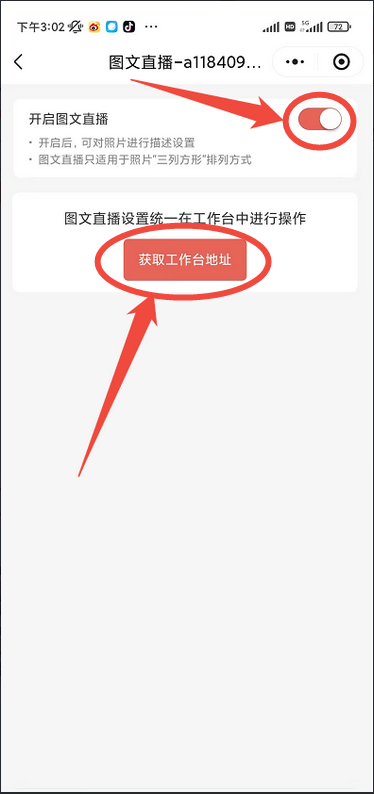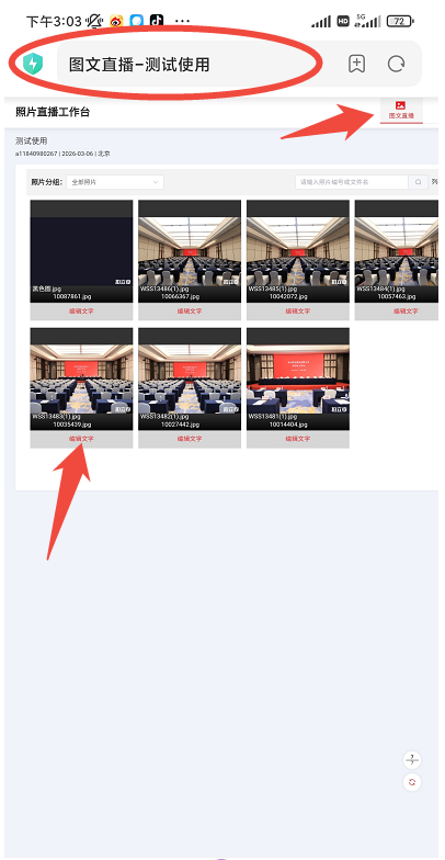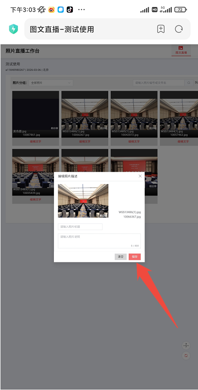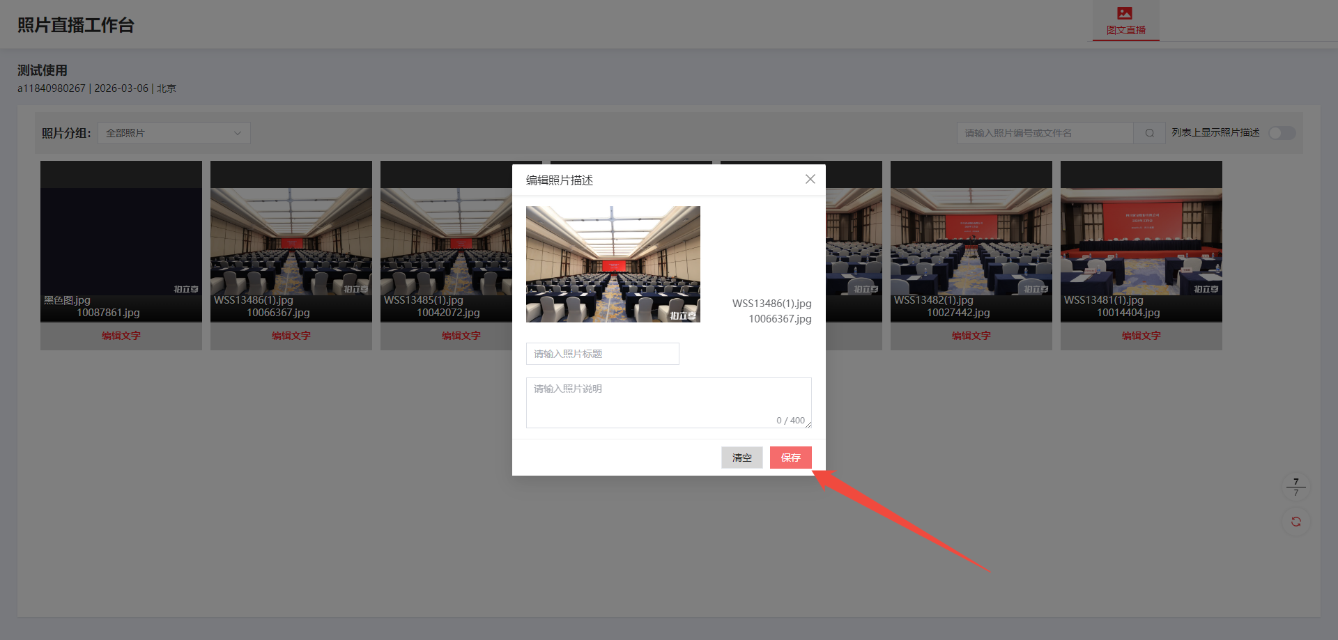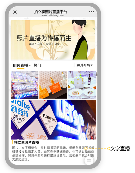 开启图文直播功能,可在直播相册中添加活动介绍文字,进行实时图文直播。
