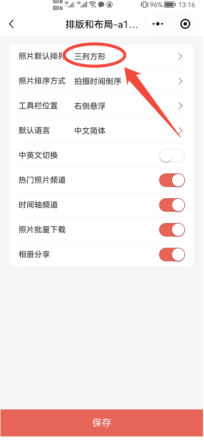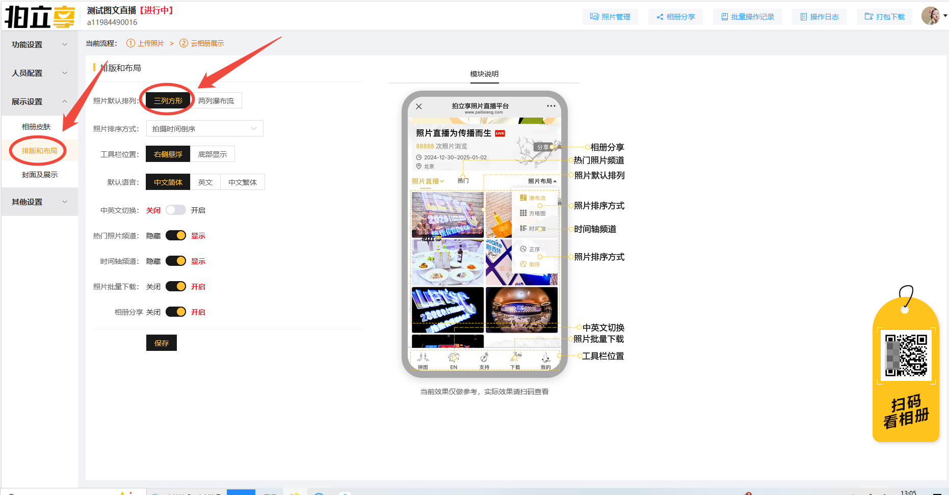 拍立享官网登录个人账号→进入“我创建的相册”→找到对应相册点击“功能设置”→展示设置→排版与布局→照片默认排列改为“三列方形”