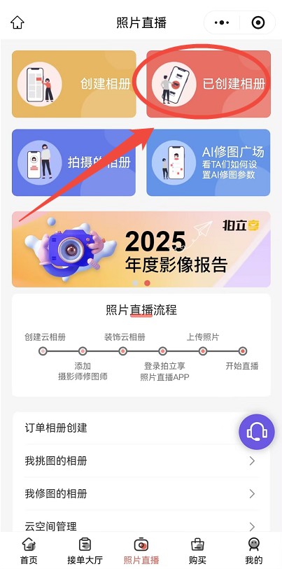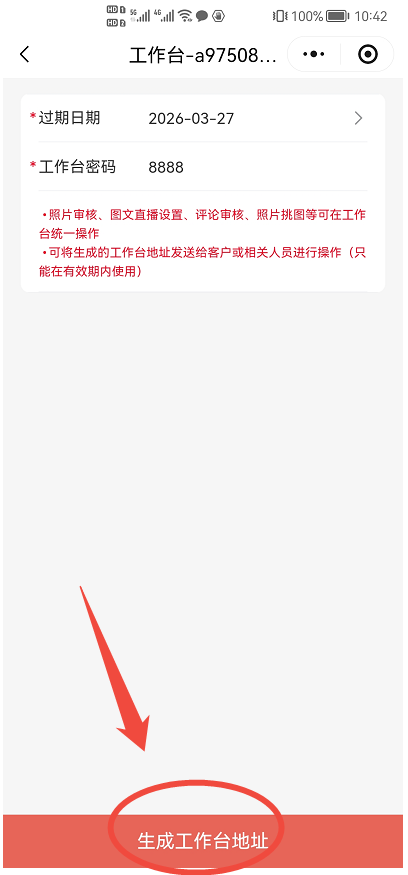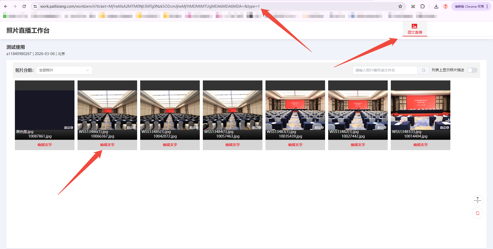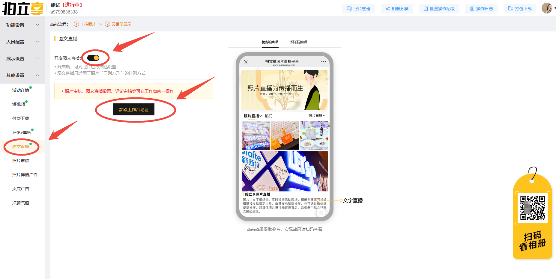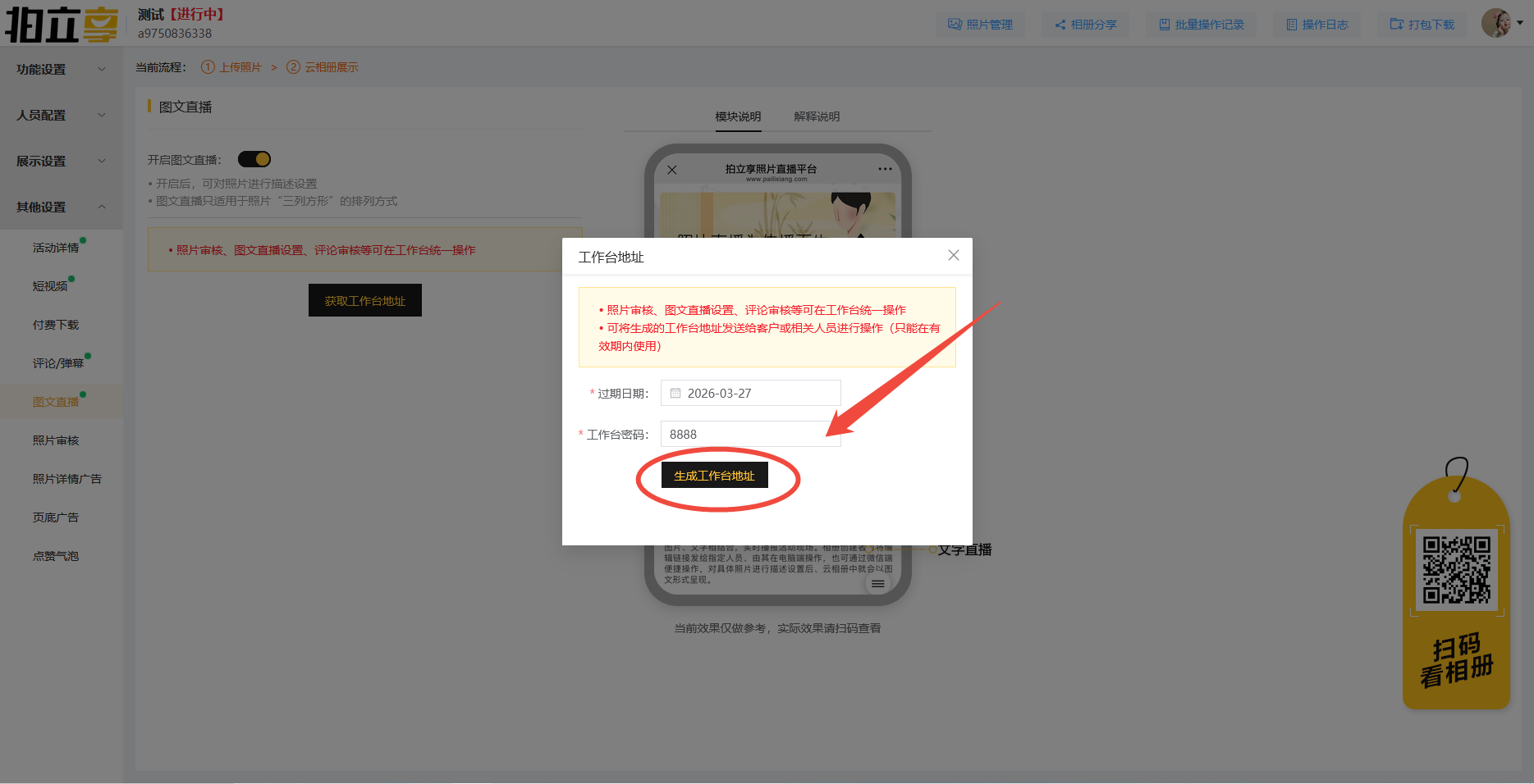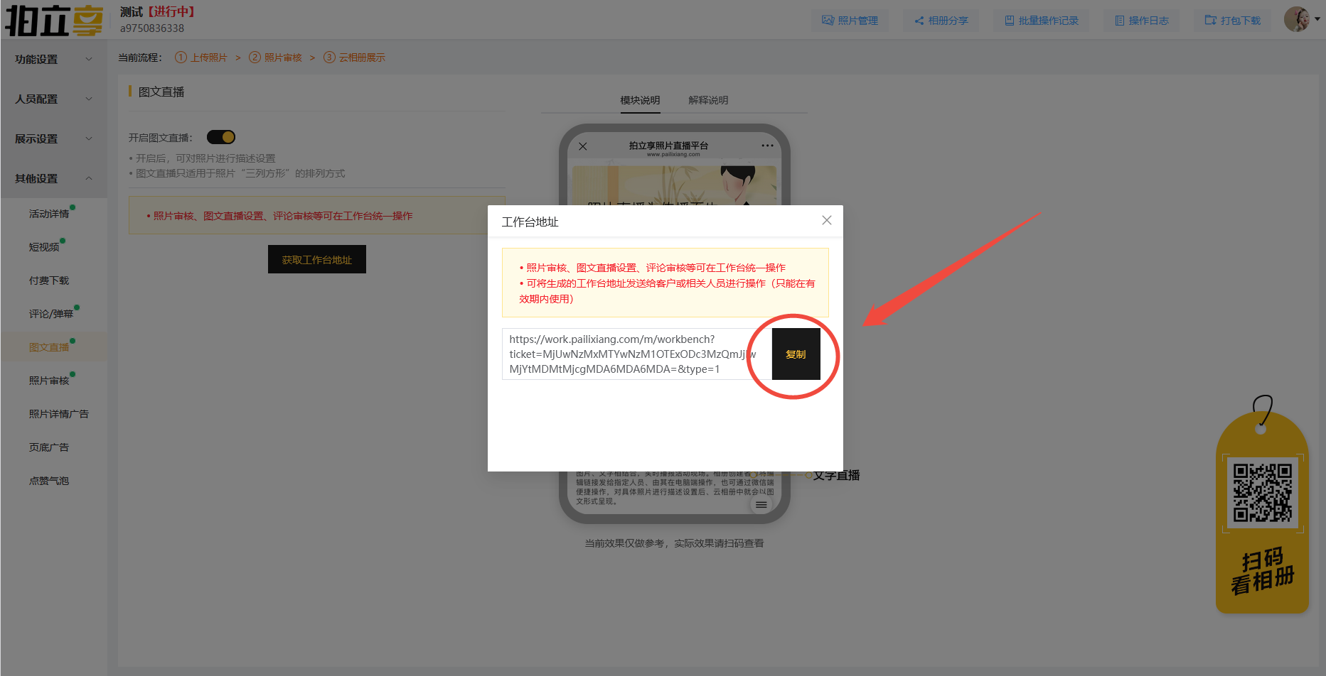 拍立享官网登录个人账号→进入“我创建的相册”→找到对应相册点击“功能设置”→其他设置→图文直播→开启→获取工作台地址→设置好过期日期和密码后→生成工作台地址→复制分享给负责编辑的人员
