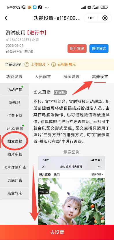 “图文直播”只适用于照片“三列方形”的排列方式,如不设置则图文直播无效不展示,需提前将照片排列方式改为:三列方形