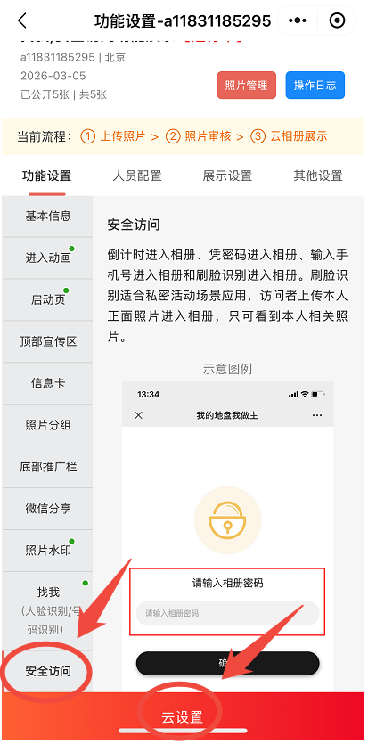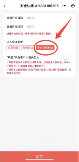 打开“我是摄影狮”小程序→进入“照片直播”→进入“已创建相册”→点击“功能设置”→安全访问→去设置→选择“手机号码验证”后保存。