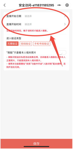 拍立享官网登录个人账号→进入“我创建的相册”→找到对应相册点击“功能设置”→安全访问→设置直播开始时间后保存。