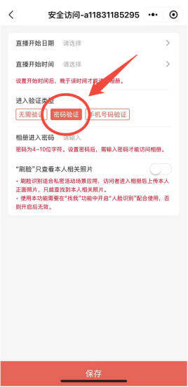 打开“我是摄影狮”小程序→进入“照片直播”→进入“已创建相册”→点击“功能设置”→安全访问→去设置→选择“密码验证”,输入4~10位字符密码后保存。
