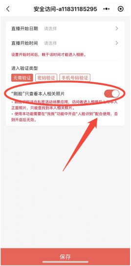 拍立享官网登录个人账号→进入“我创建的相册”→找到对应相册点击“功能设置”→安全访问→开启“刷脸只查看本人相关照片”按钮并保存。