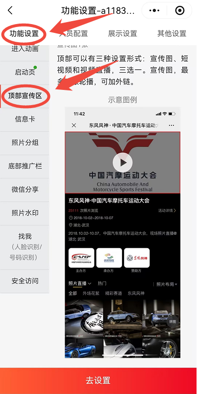 打开“我是摄影狮”小程序→进入“照片直播”→进入“已创建相册”→点击“功能设置”→点击“顶部宣传区”→设置后保存