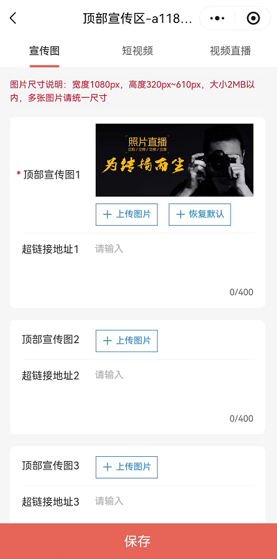 - 宣传图尺寸要求:宽度1080px,高度320px~610px,大小2MB以内,多张图片请统一尺寸;