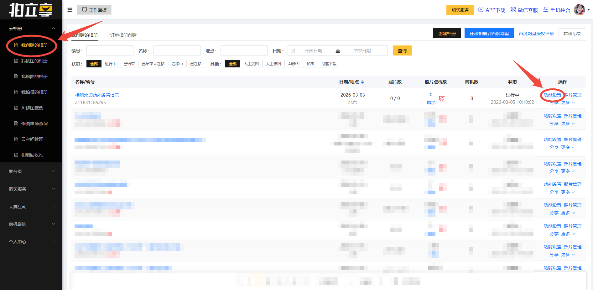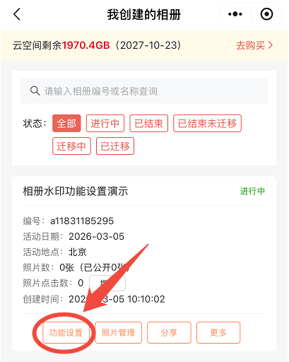 重新一键生成步骤:进入我创建的相册→功能设置→照片水印→点击“提交重新生成水印”